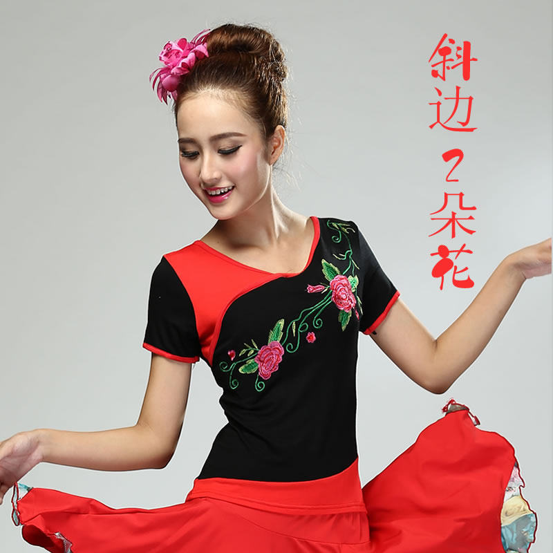广场舞服装新款跳舞衣莫代尔长短袖练习喇叭袖舞蹈刺绣花纯棉上衣
