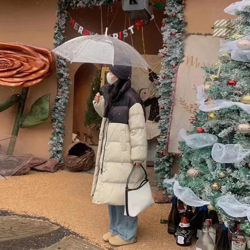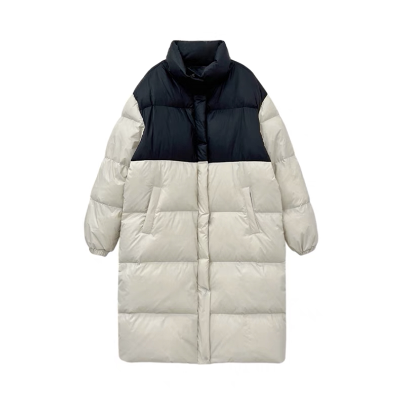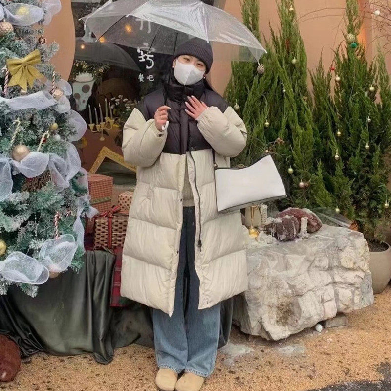 撞色立领羽绒服女长款过膝冬2025新款韩版宽松复古百搭白鸭绒外套