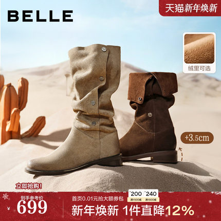 吴千语同款百丽女靴荒野来信西部牛仔靴加绒雪地靴长筒靴3QFC3DG5
