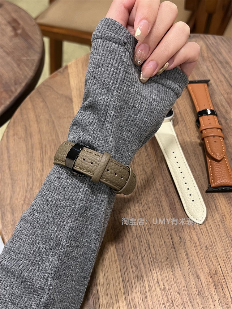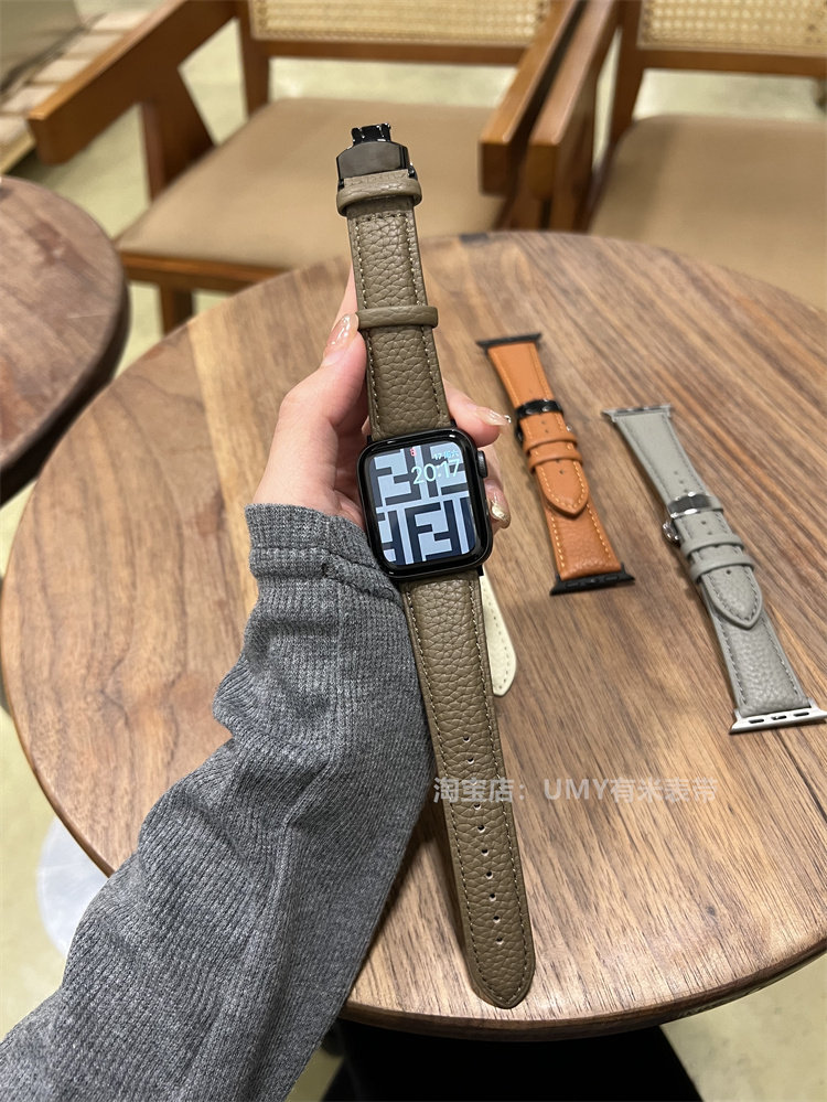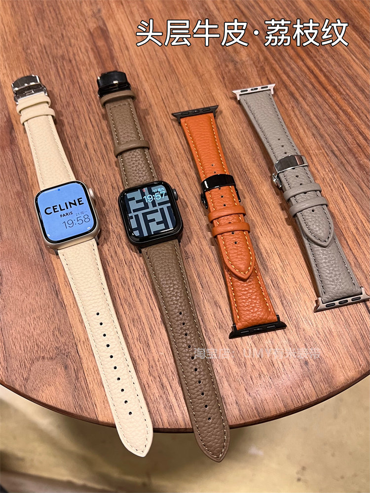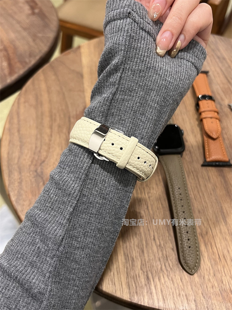 适用于苹果手表applewatchs987se星光荔枝纹蝴蝶扣真牛皮表带男女