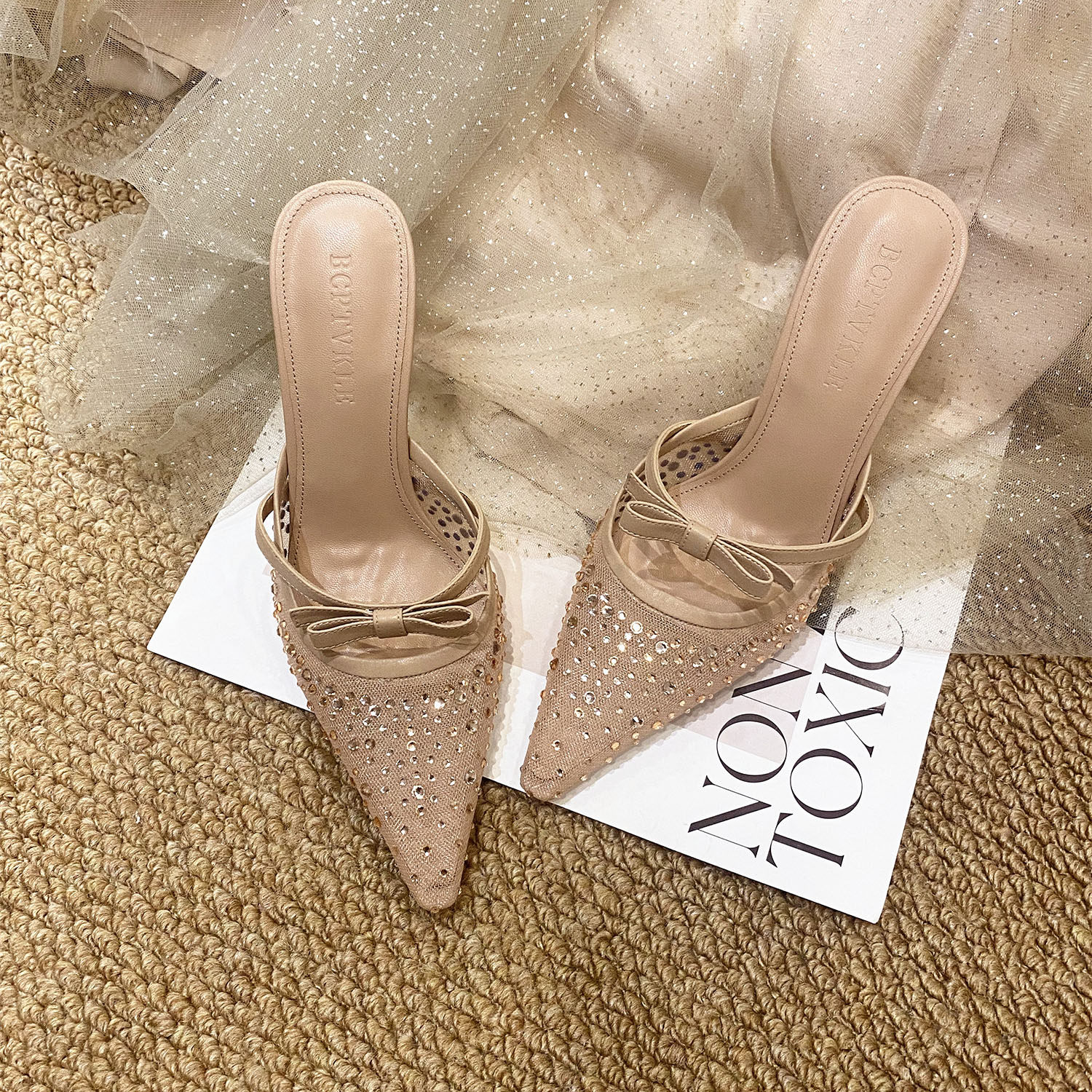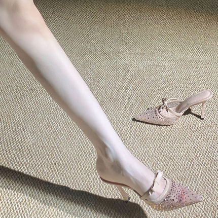 盛夏流行风格包头凉鞋女款2025新款性感网纱水钻蝴蝶结高跟鞋单鞋