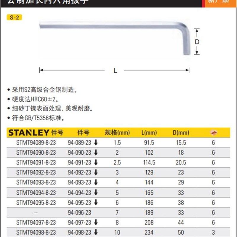 史丹利 S2合金钢公制加长平头内六角扳手 内六方工具(型号全)
