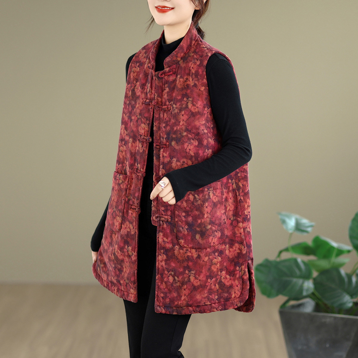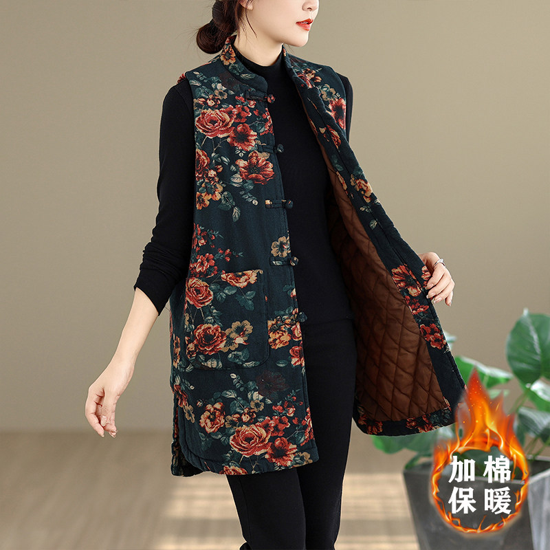 民族风碎花加棉马甲棉袄女冬休闲洋气中长款坎肩复古盘扣马夹外套