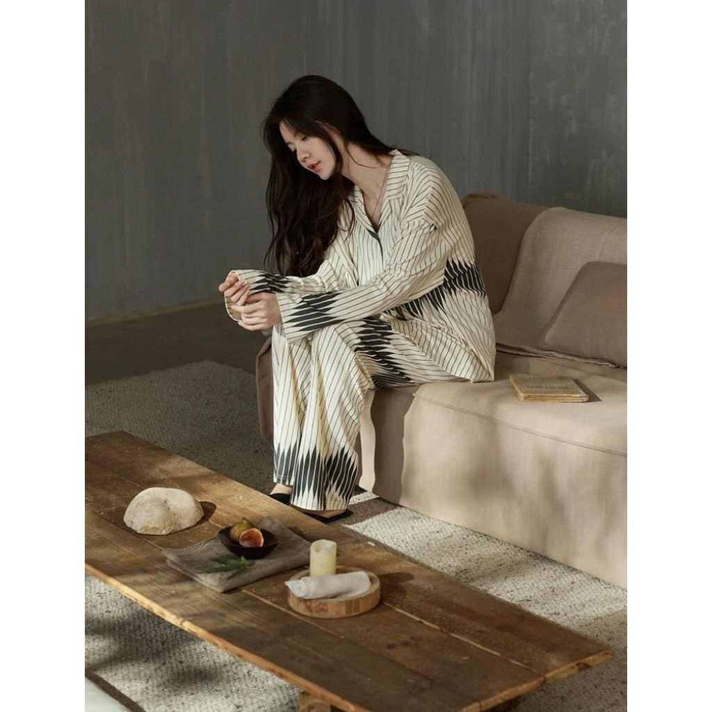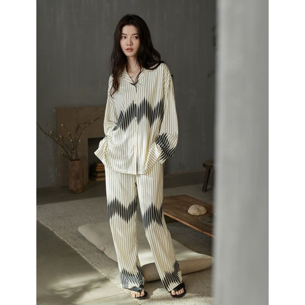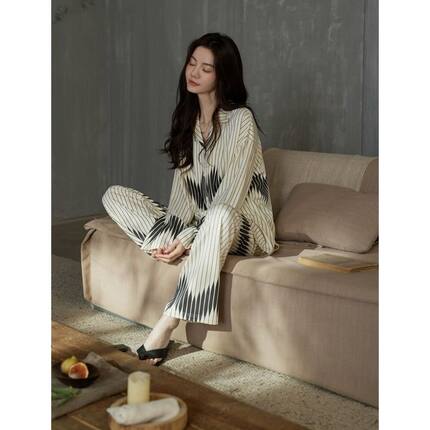 女士休闲春秋新款条纹睡衣套装长袖长裤韩版开衫纯棉家居服可外穿