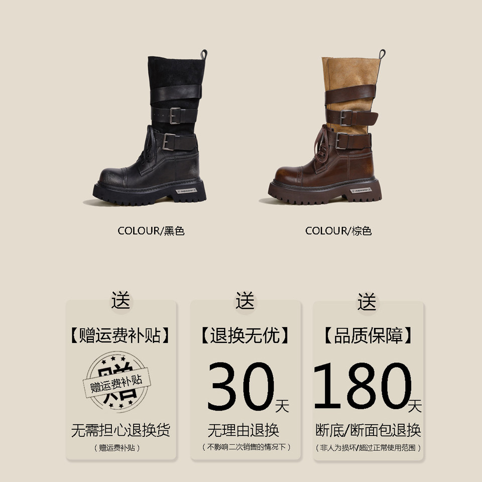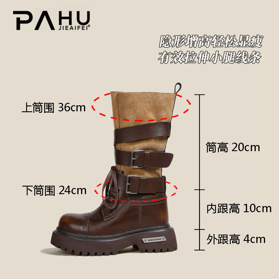 隐形内增高12-14CM复古皮带扣中筒靴子女秋冬季小个子真皮马丁靴