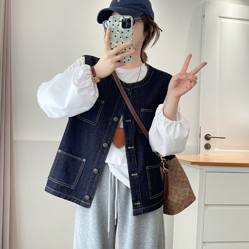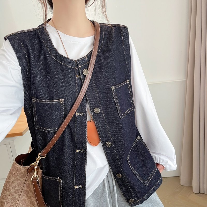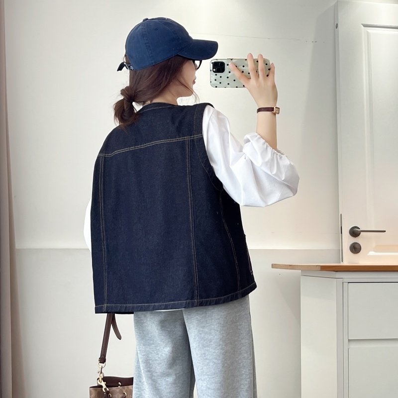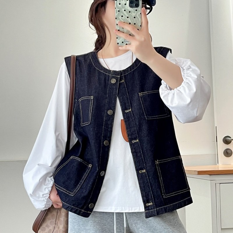 秋装韩版新款明线口袋牛仔马甲宽松圆领无袖坎肩背心外套大码上衣