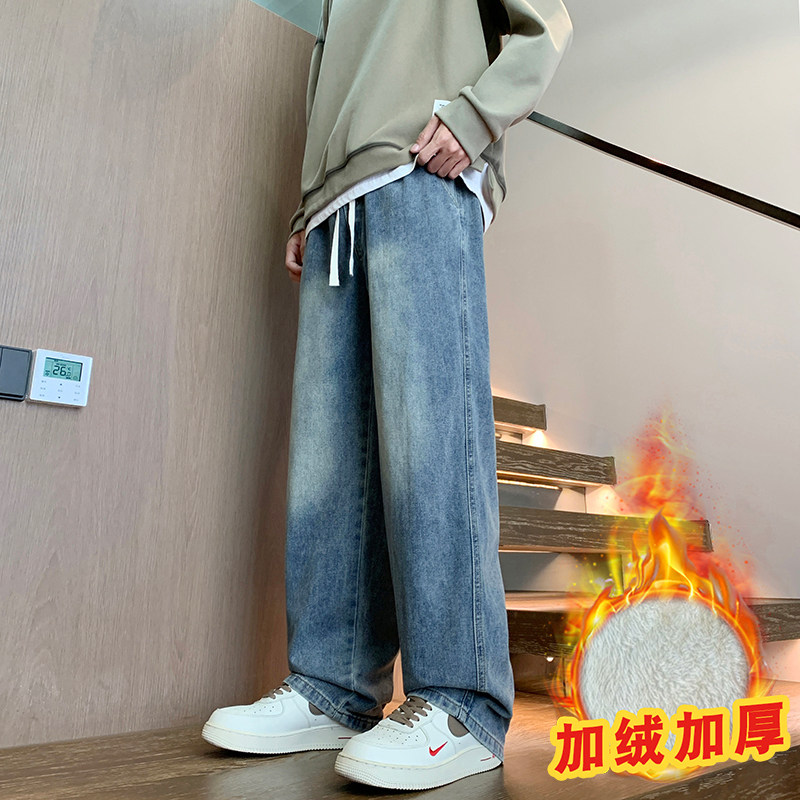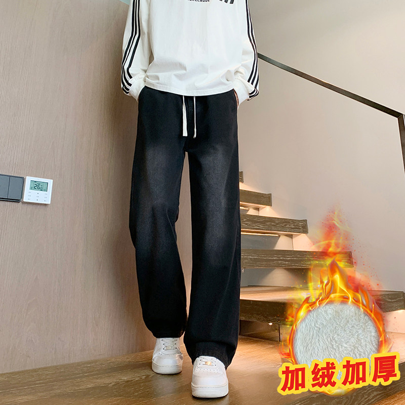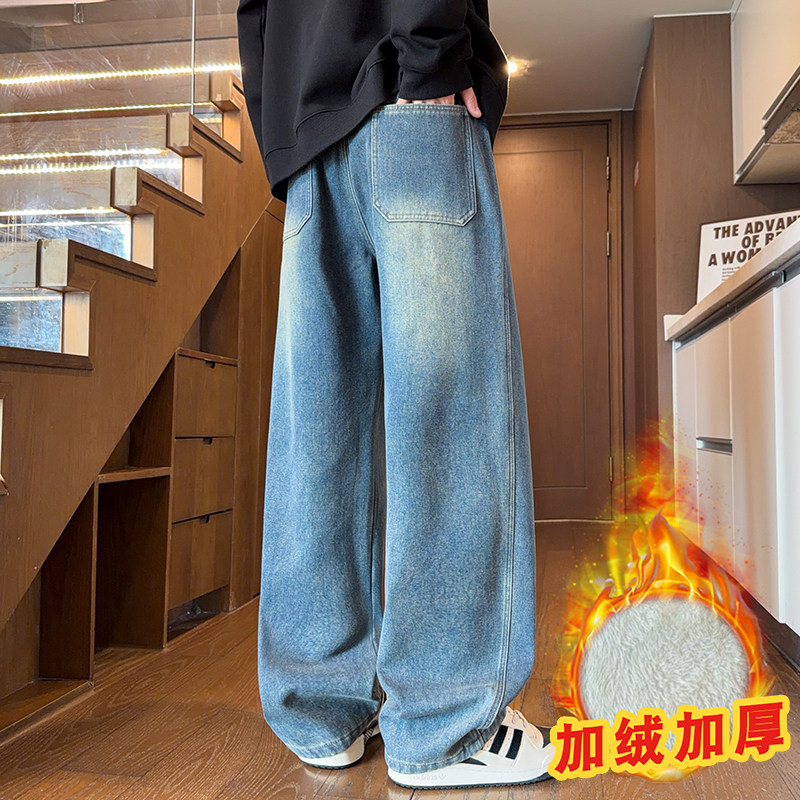 美式高街复古冬季新款青少年牛仔裤直筒阔腿加绒加厚男生保暖长裤