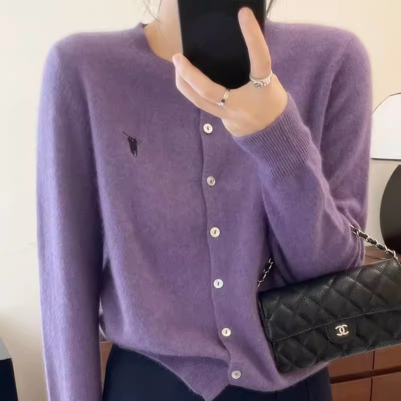 春秋季100%纯羊毛开衫女圆领小马标圆领针织衫百搭气质毛衣外套潮