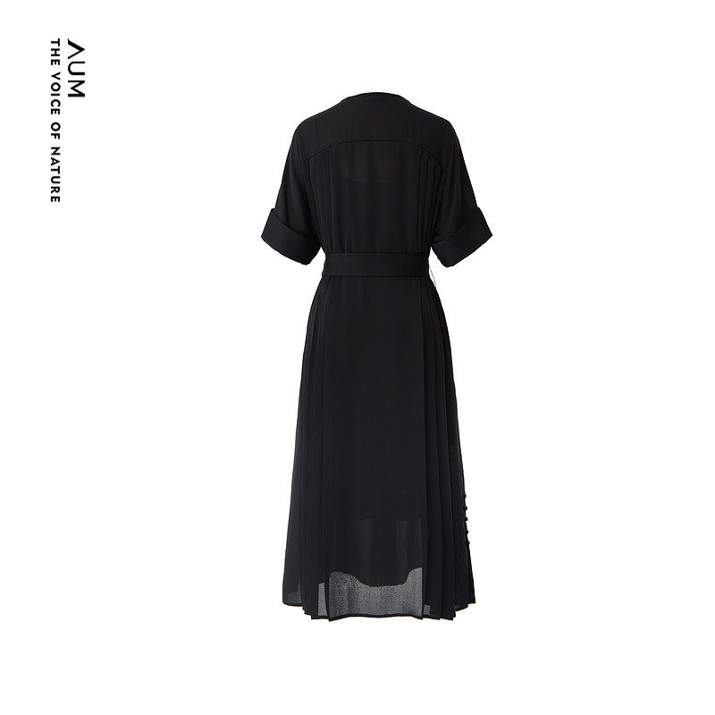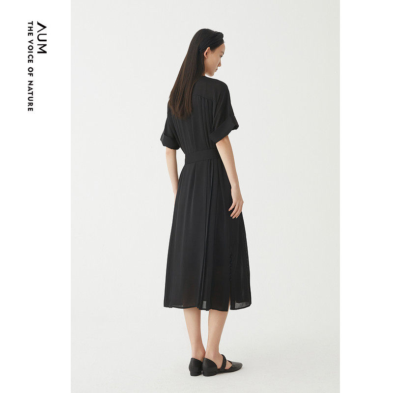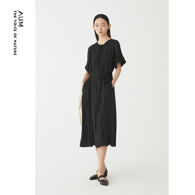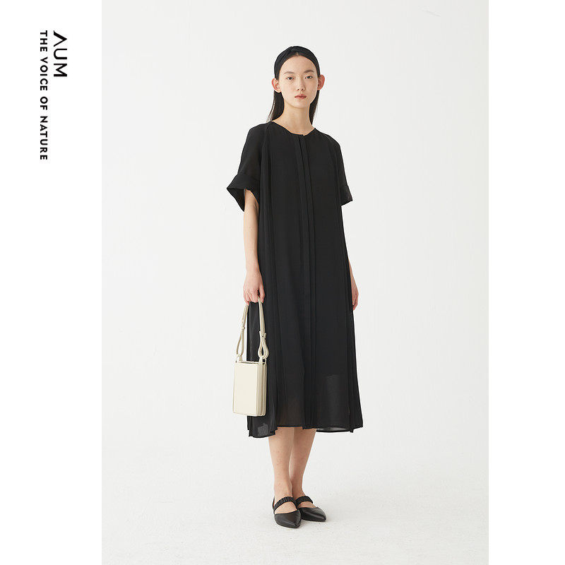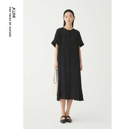 AUM噢姆夏季黑色圆领飘逸垂坠直筒裙连衣裙