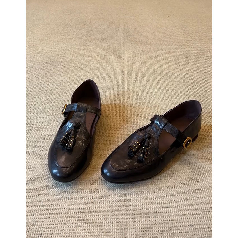 羊皮版~真皮文艺平底流苏圆头铆钉浅口单鞋女百搭通勤平底玛丽珍
