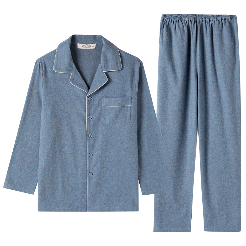 美标春秋新款长袖纯棉睡衣套装男士休闲简约梭织磨毛全棉家居服冬