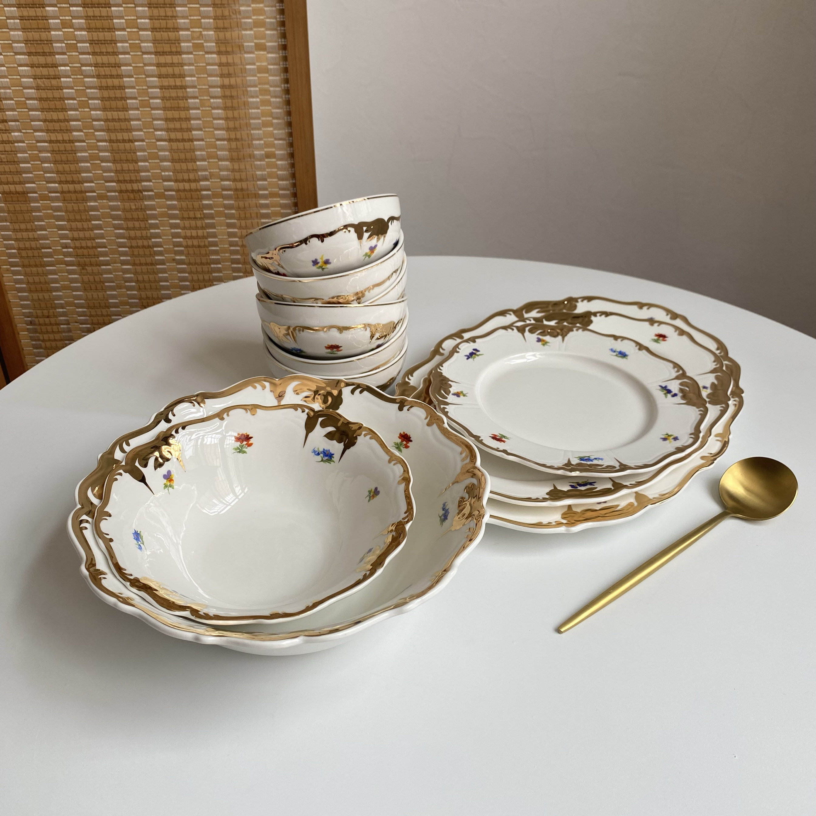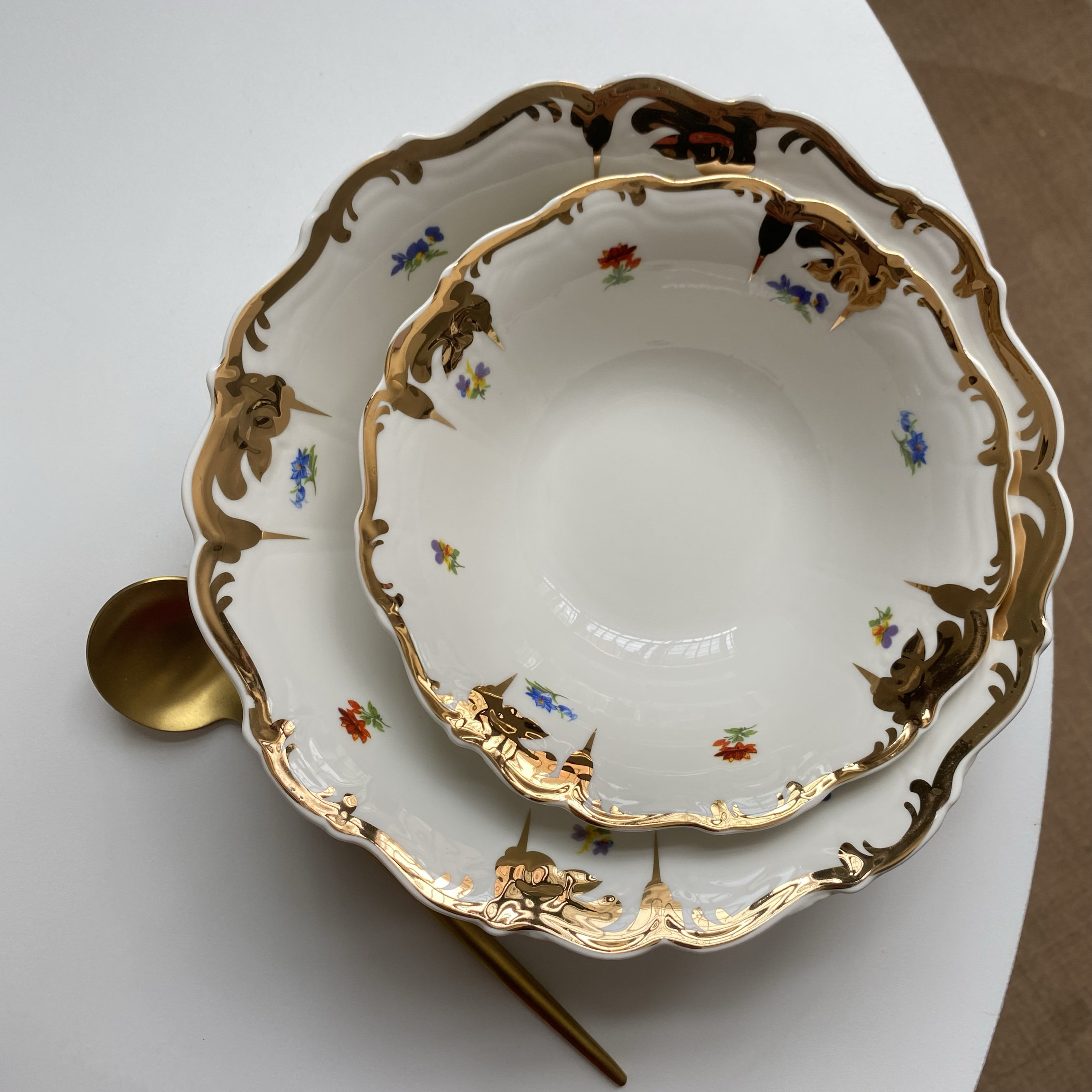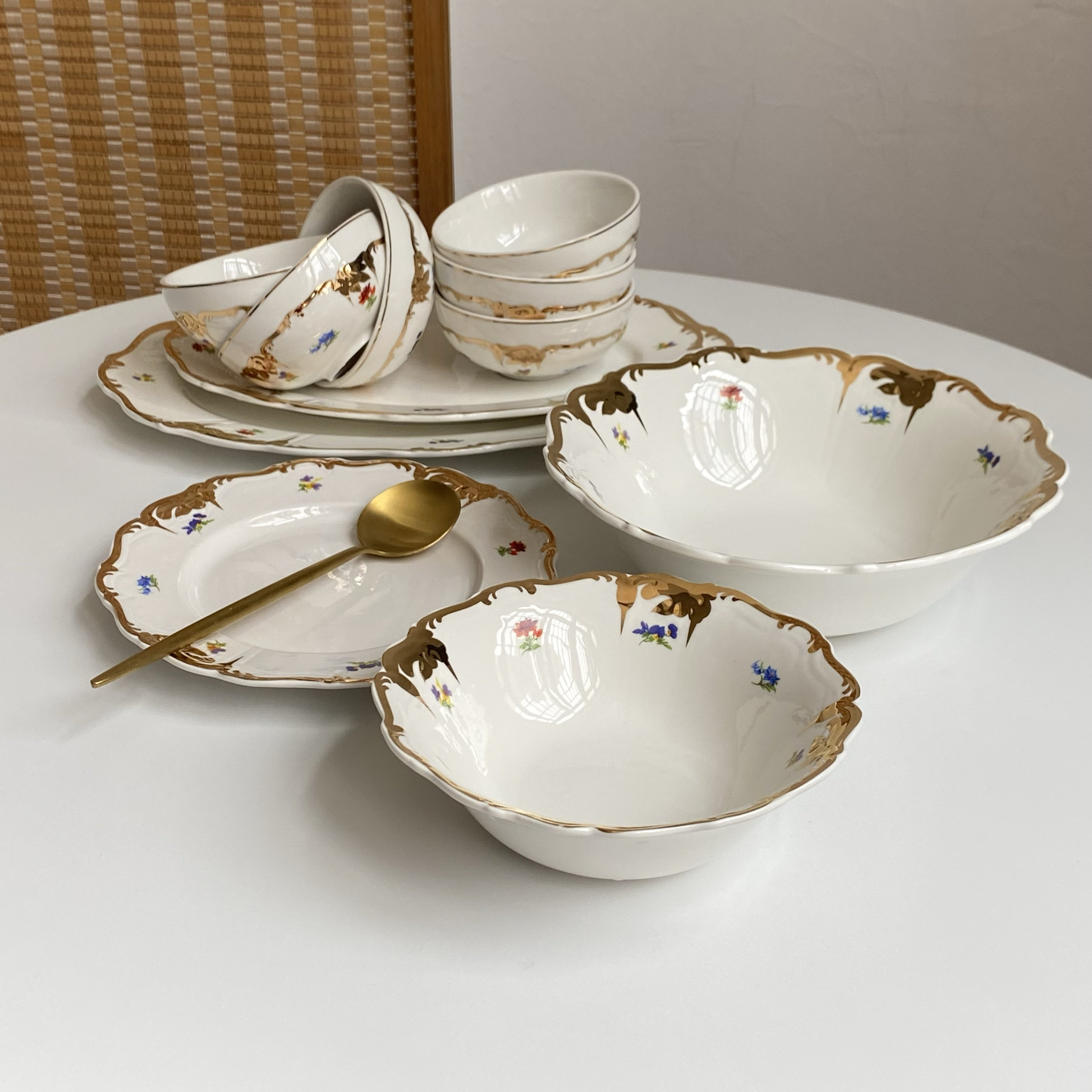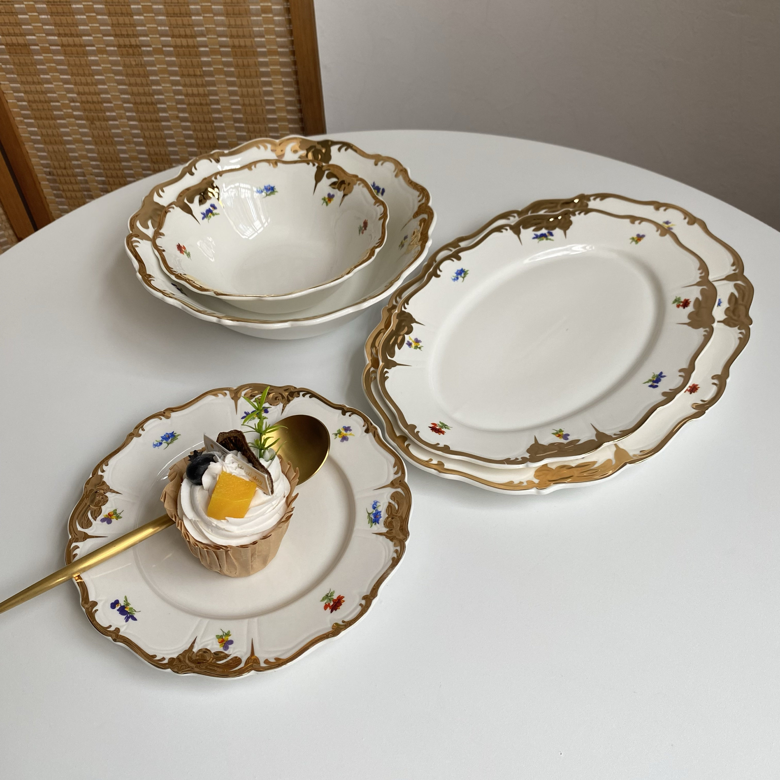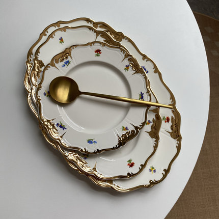 原单尾货奢华重工鎏金陶瓷餐具碗盘套装小朵花大号沙拉碗鱼盘大号