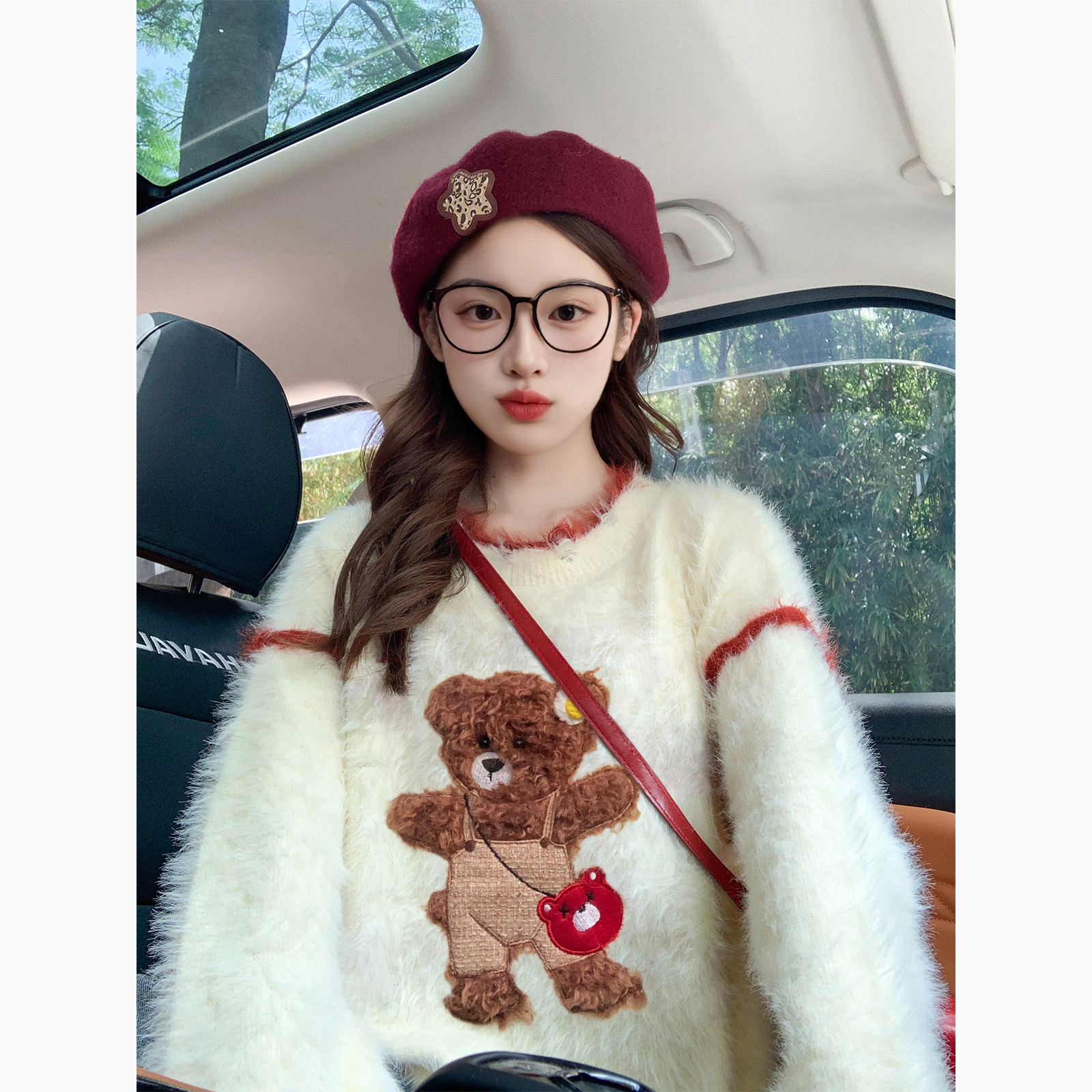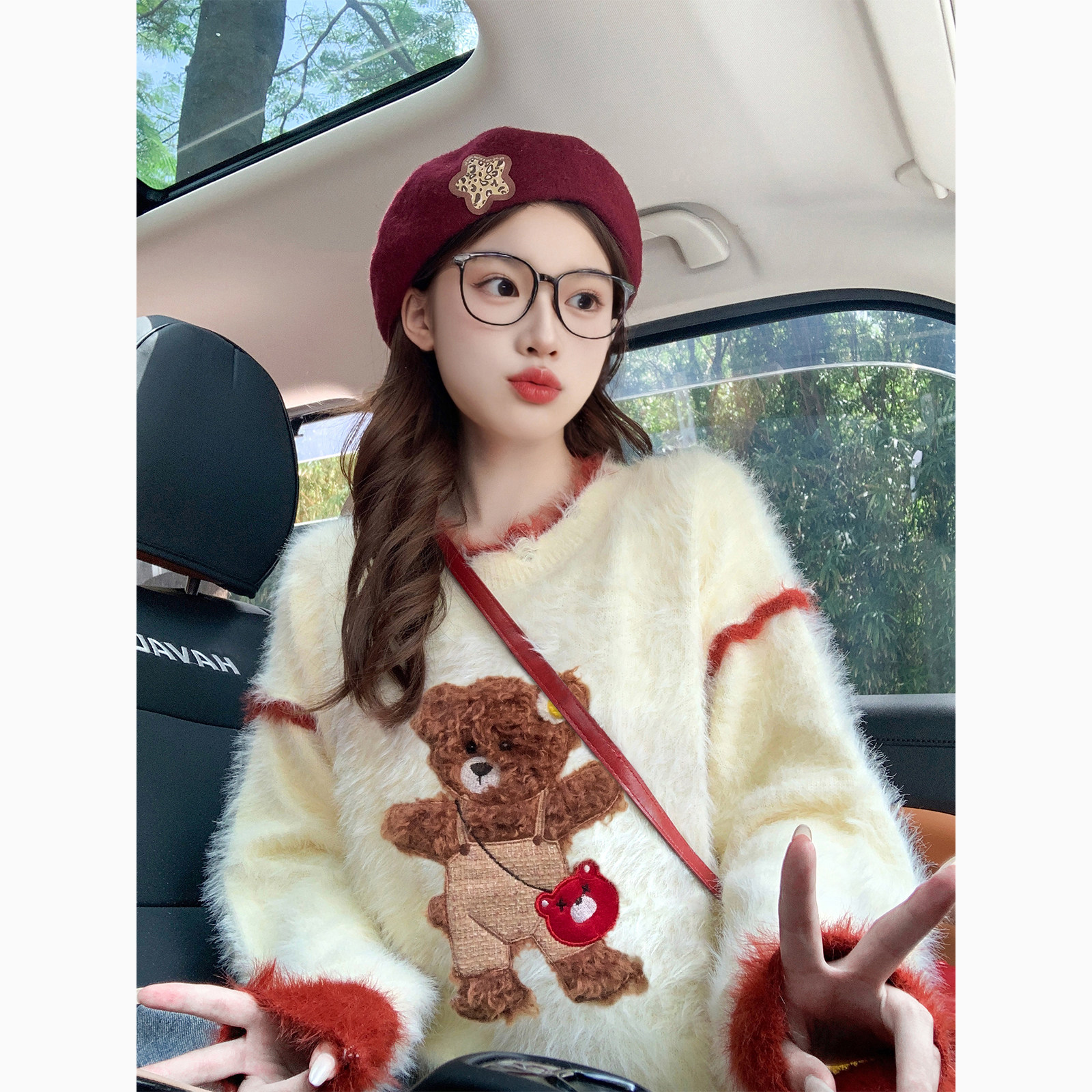 可爱小熊绣花贴布新年本命年毛衣女冬季慵懒红色水貂绒加厚上衣女