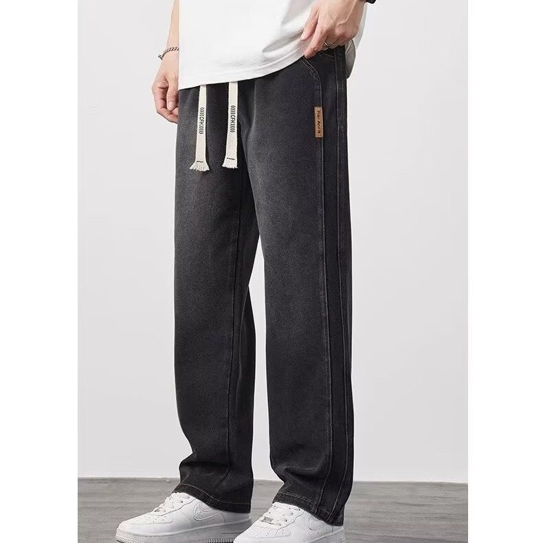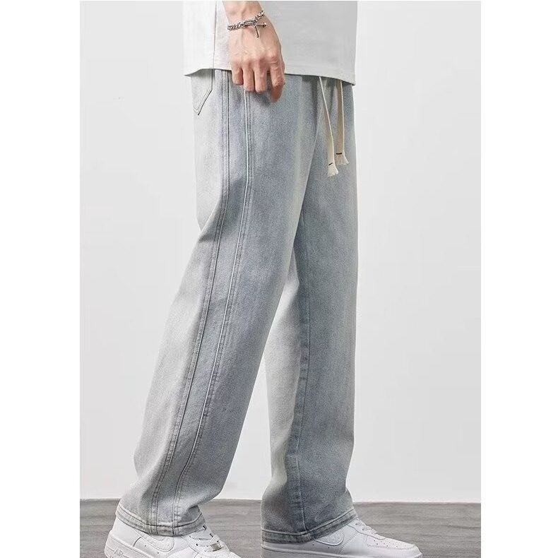 松紧腰牛仔裤男春秋直筒宽松美式复古高街潮牌青少年百搭休闲长裤