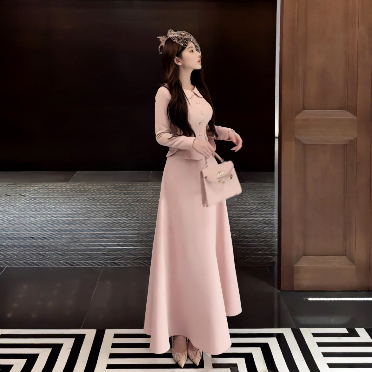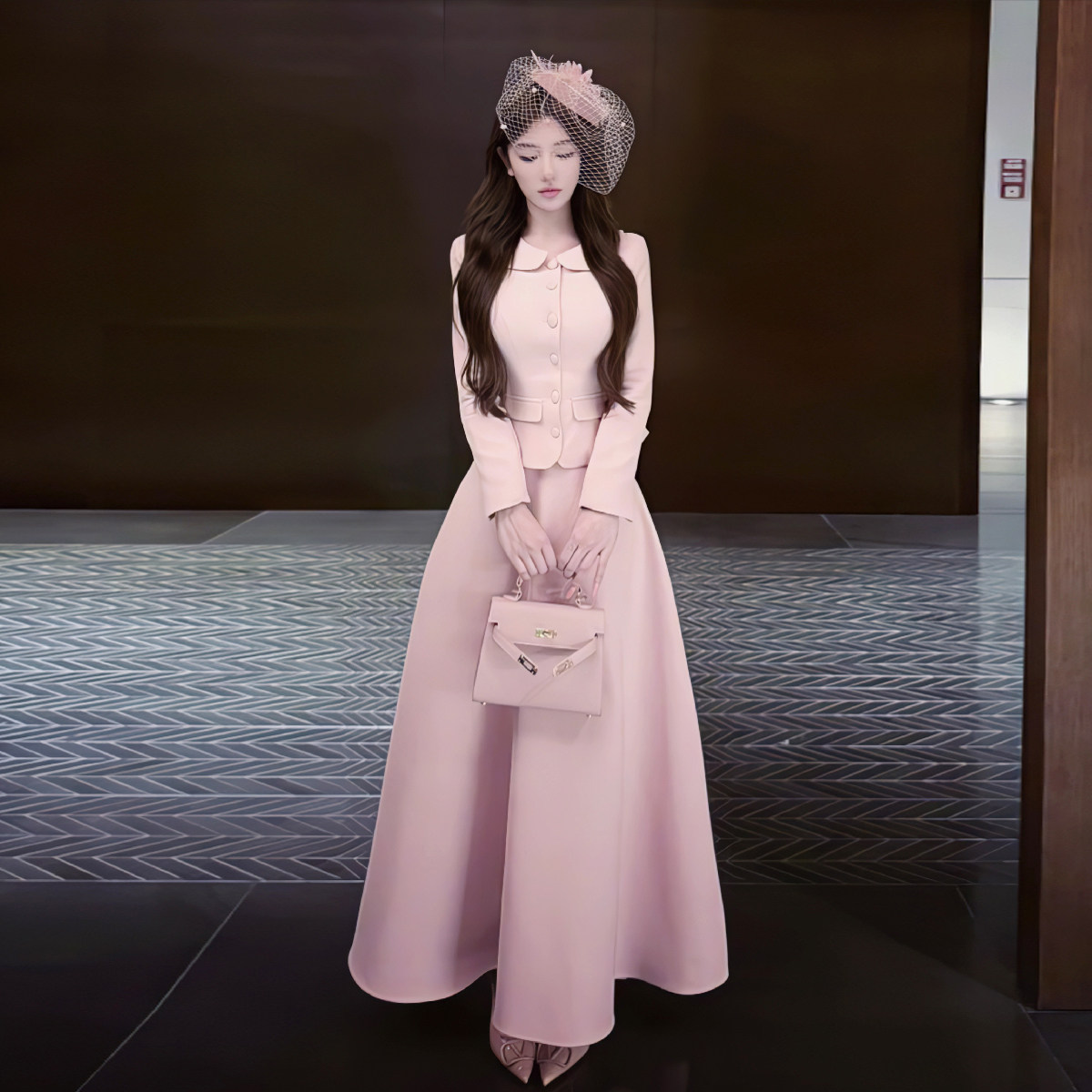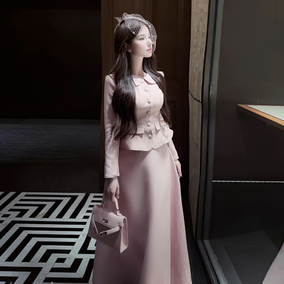 大码胖mm法式温柔风粉色娃娃领上衣半身裙女秋冬新款收腰显瘦套装