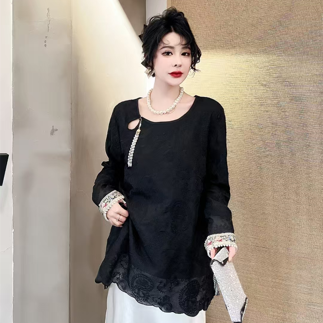 大码宽松中国风盘扣钉珠刺绣衬衫