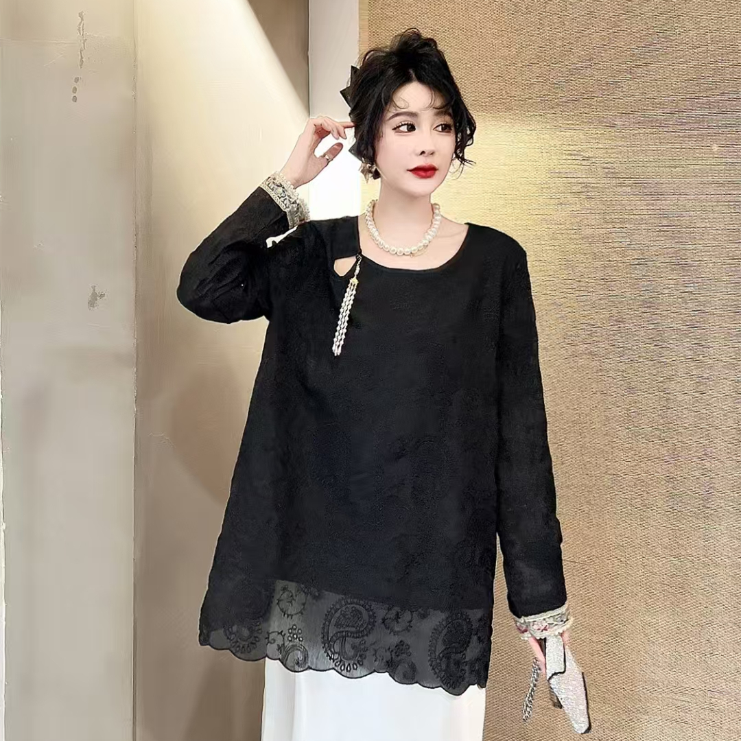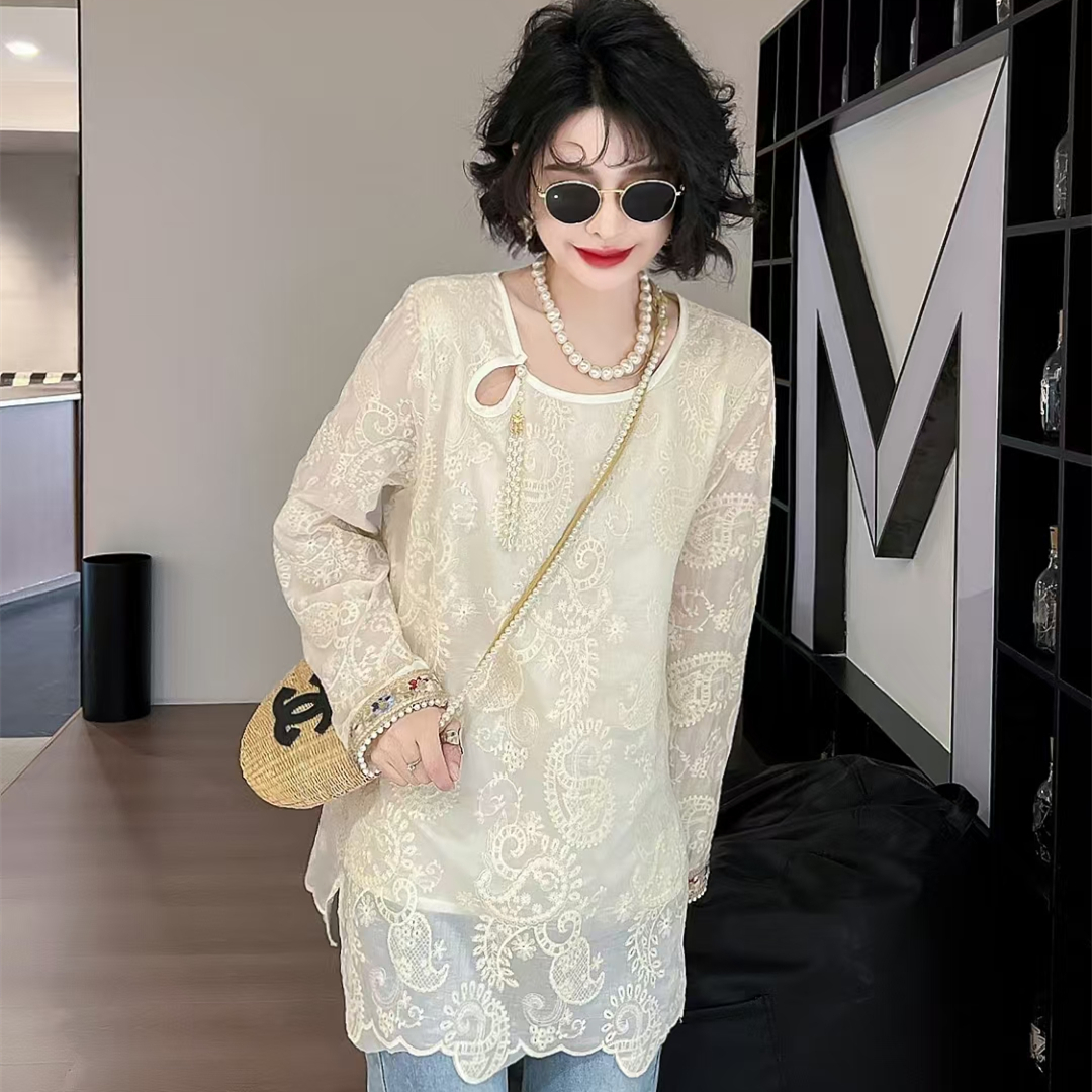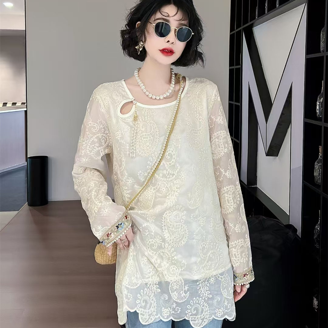 夏季新款国风新中式刺绣钉珠衬衫防晒衫吊坠中长款蕾丝上衣女