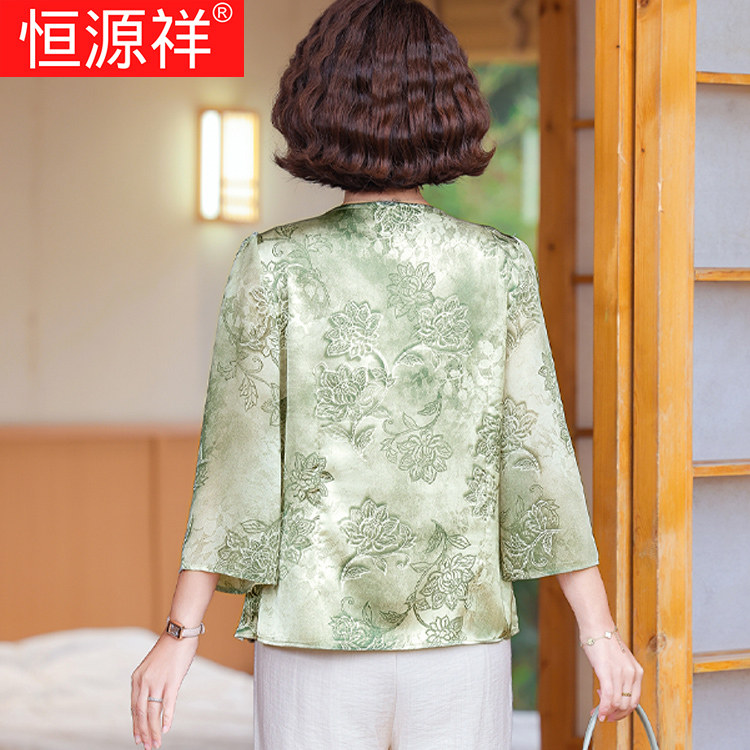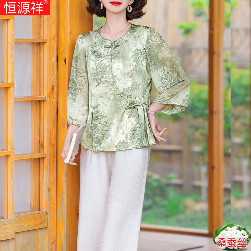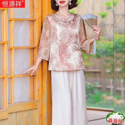 恒源祥母亲节2025夏季桑蚕丝中老年女宽松女装新中式国风真丝套装