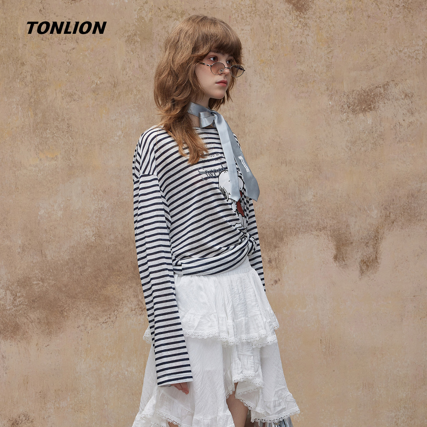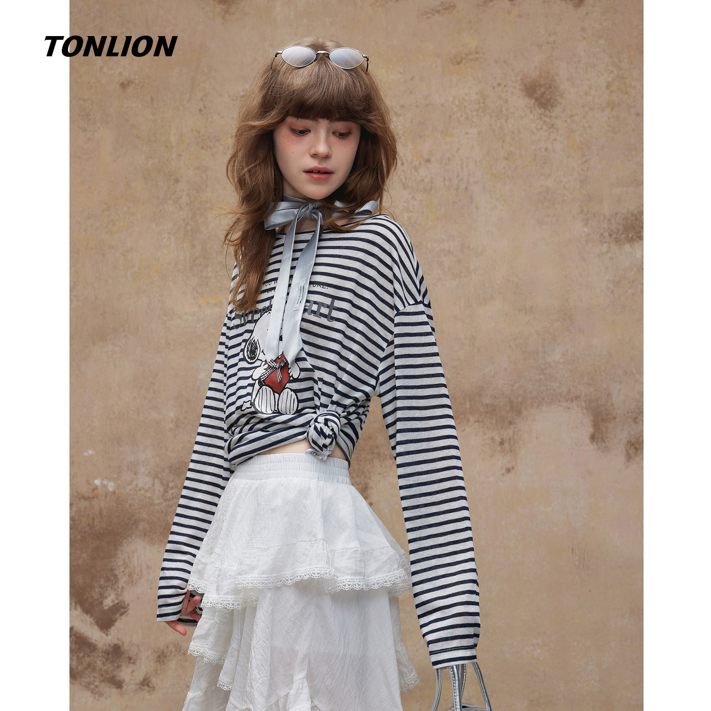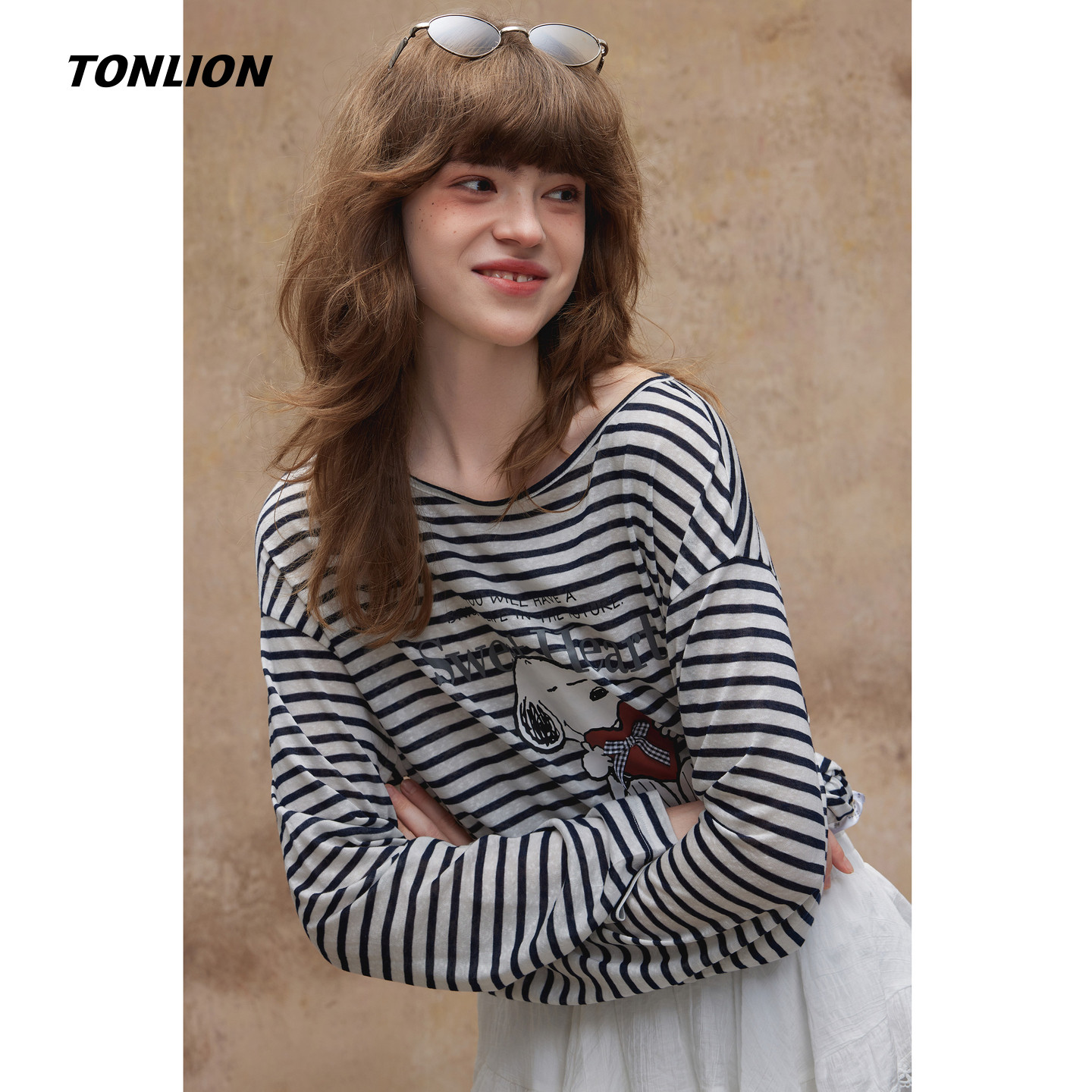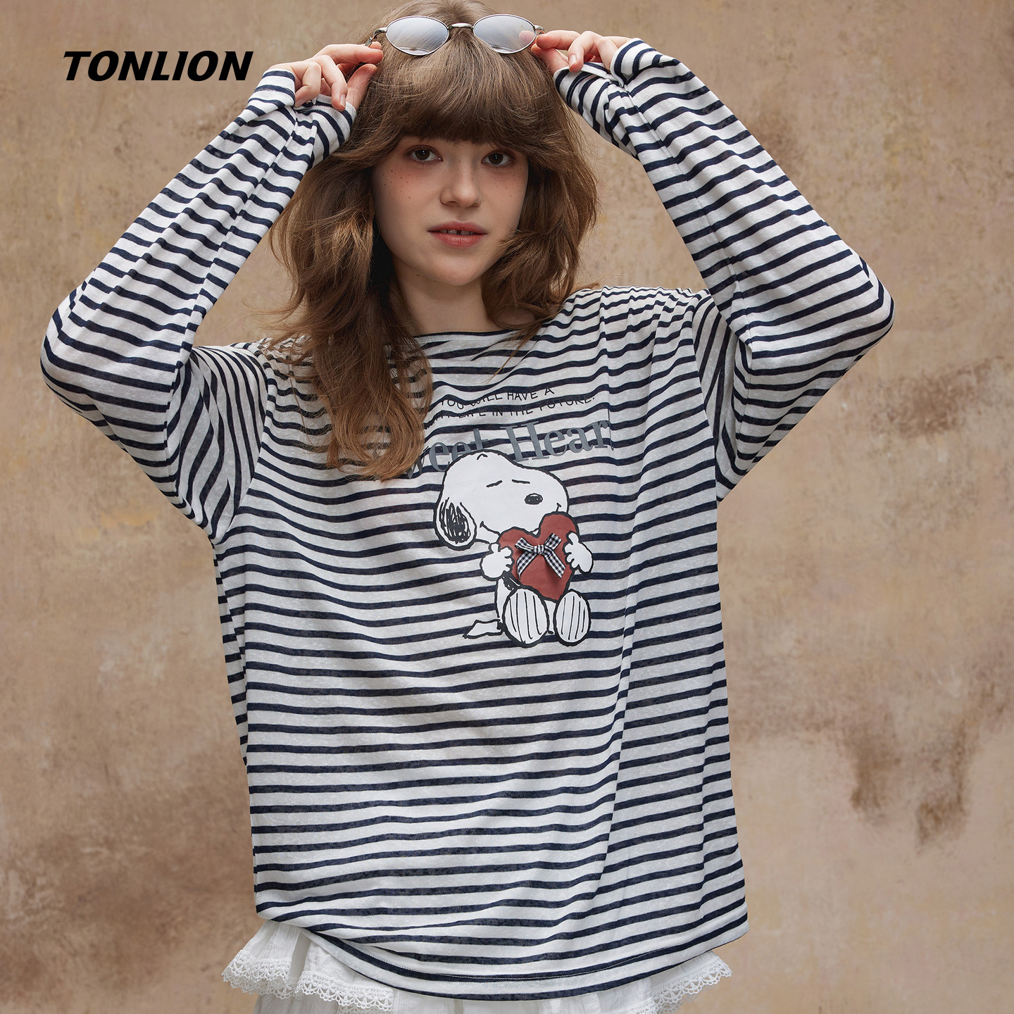 【史努比联名款】唐狮2025秋季长袖T恤女圆领条纹宽松上衣休闲风