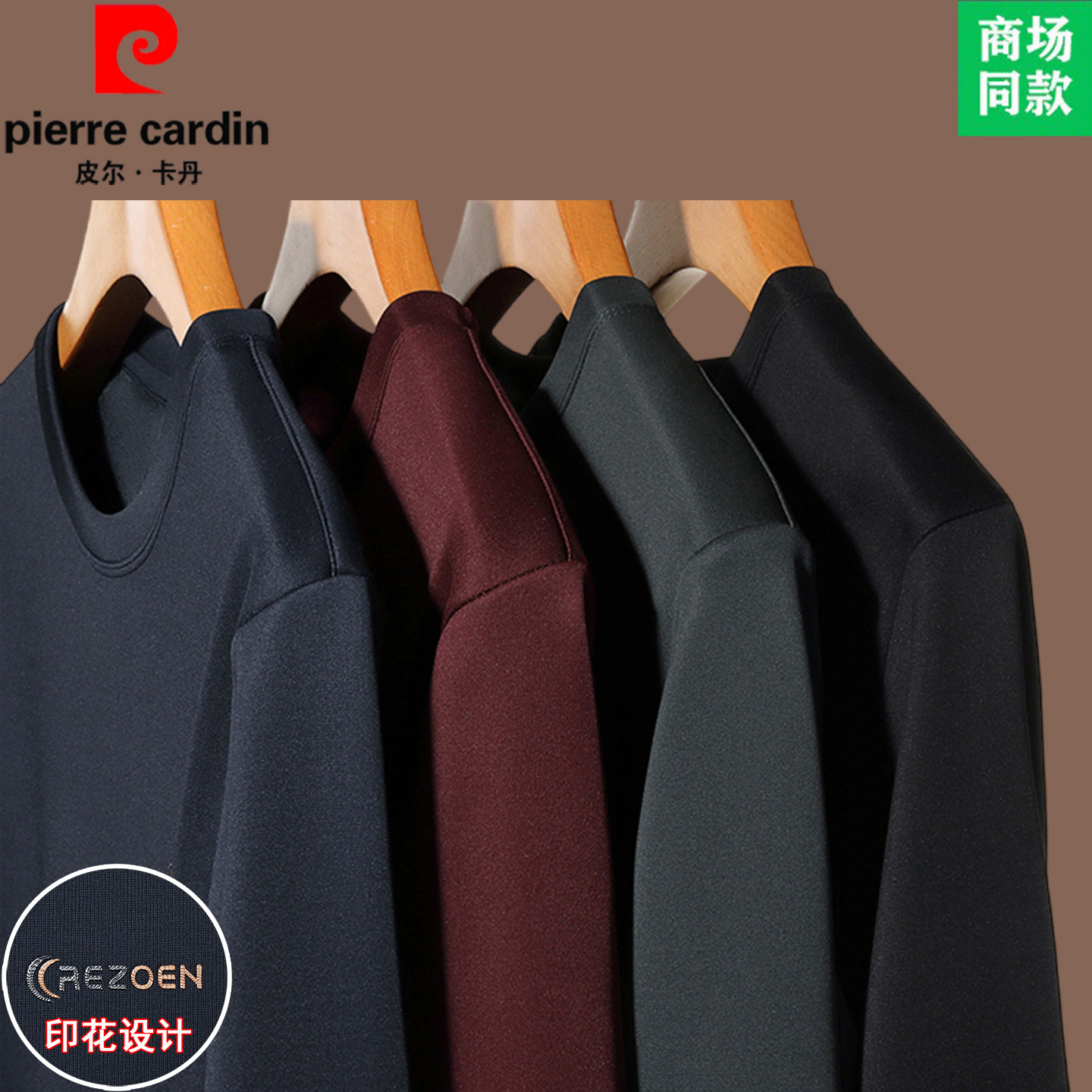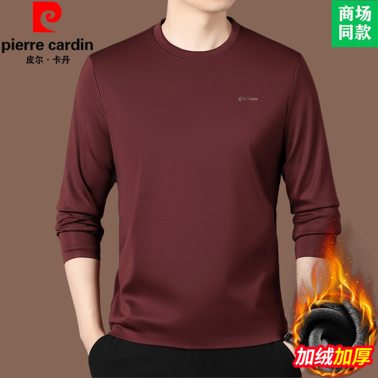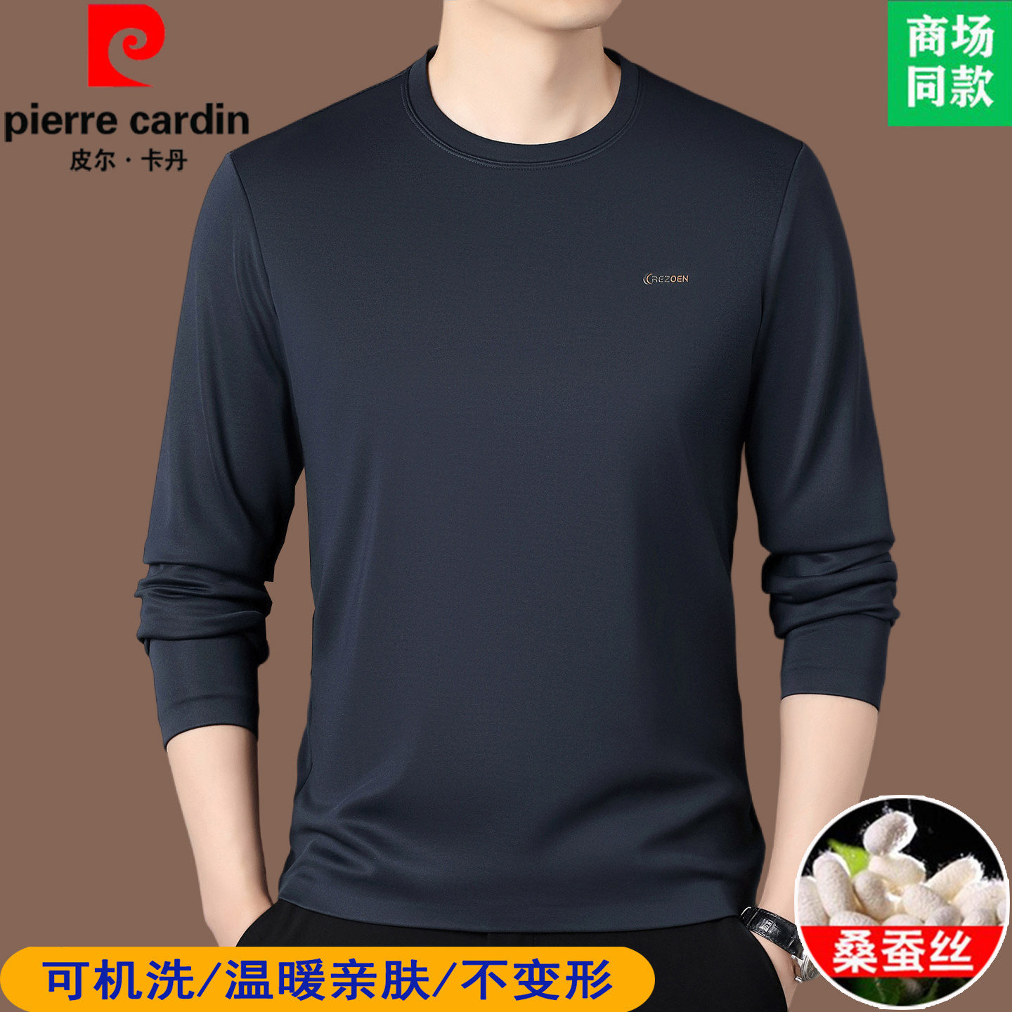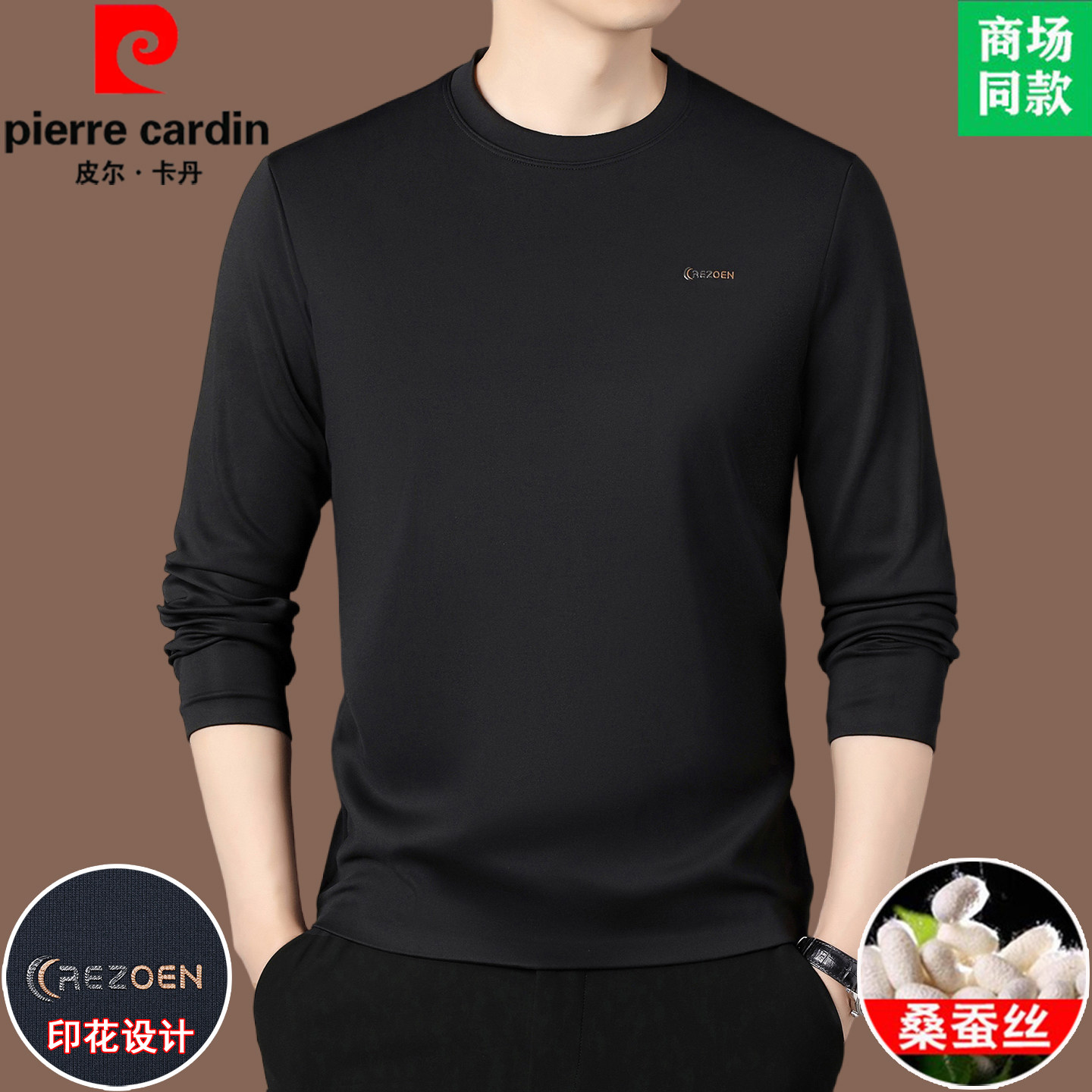 皮尔卡丹轻奢桑蚕丝长袖t恤男士纯色秋冬打底衫高端卫衣加绒T恤衫