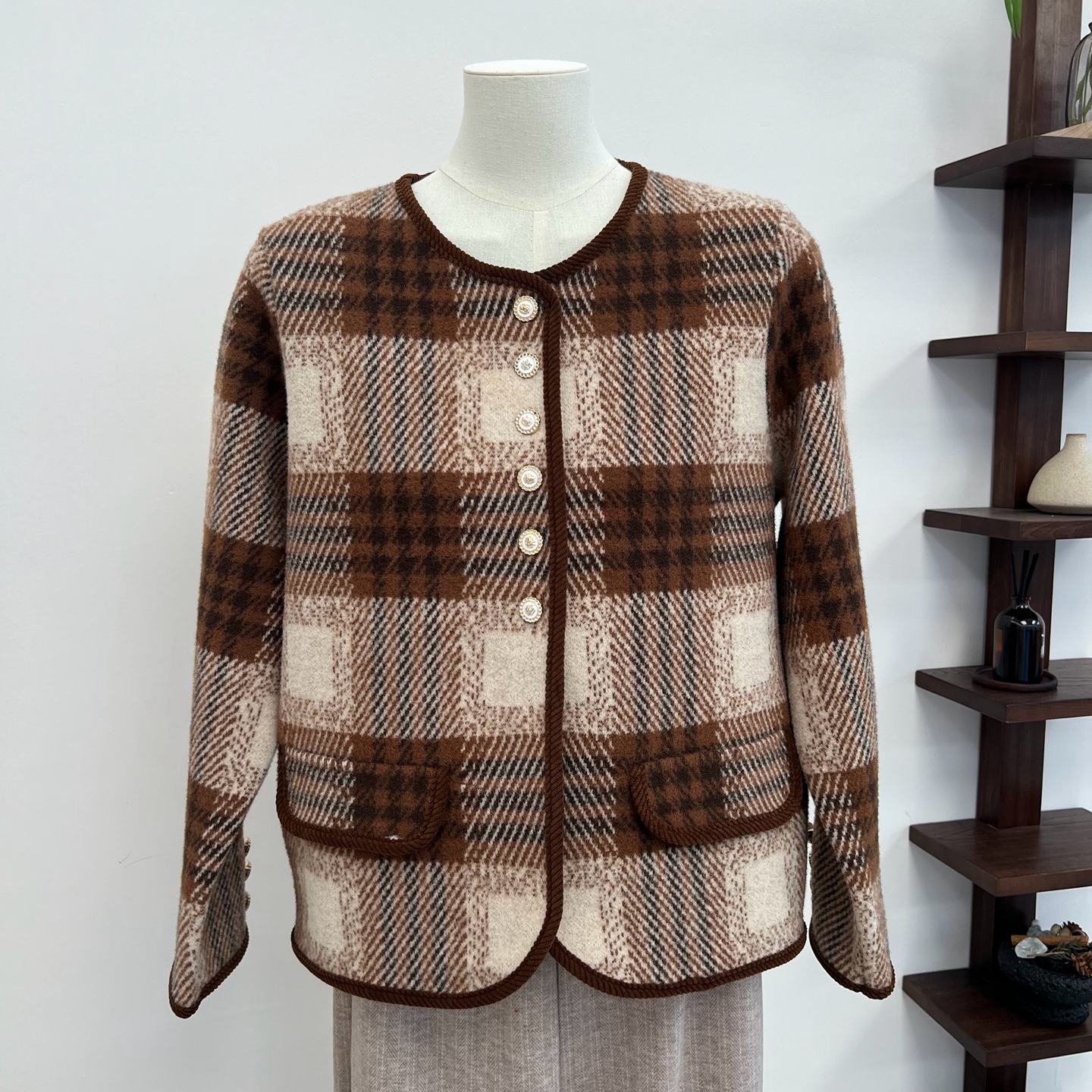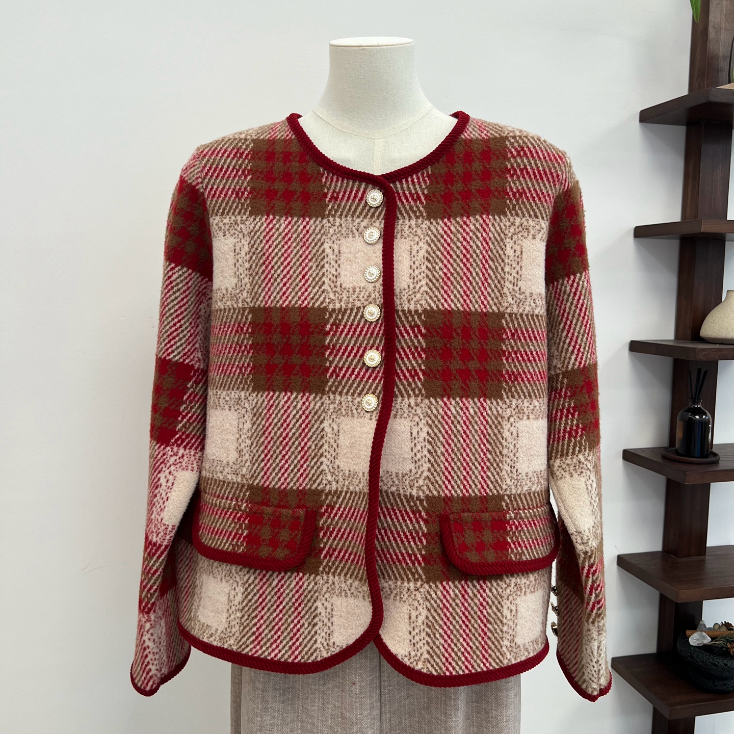 秋冬妈妈装小香风短款呢子厚外套中老年圆领花格子外穿上衣女装