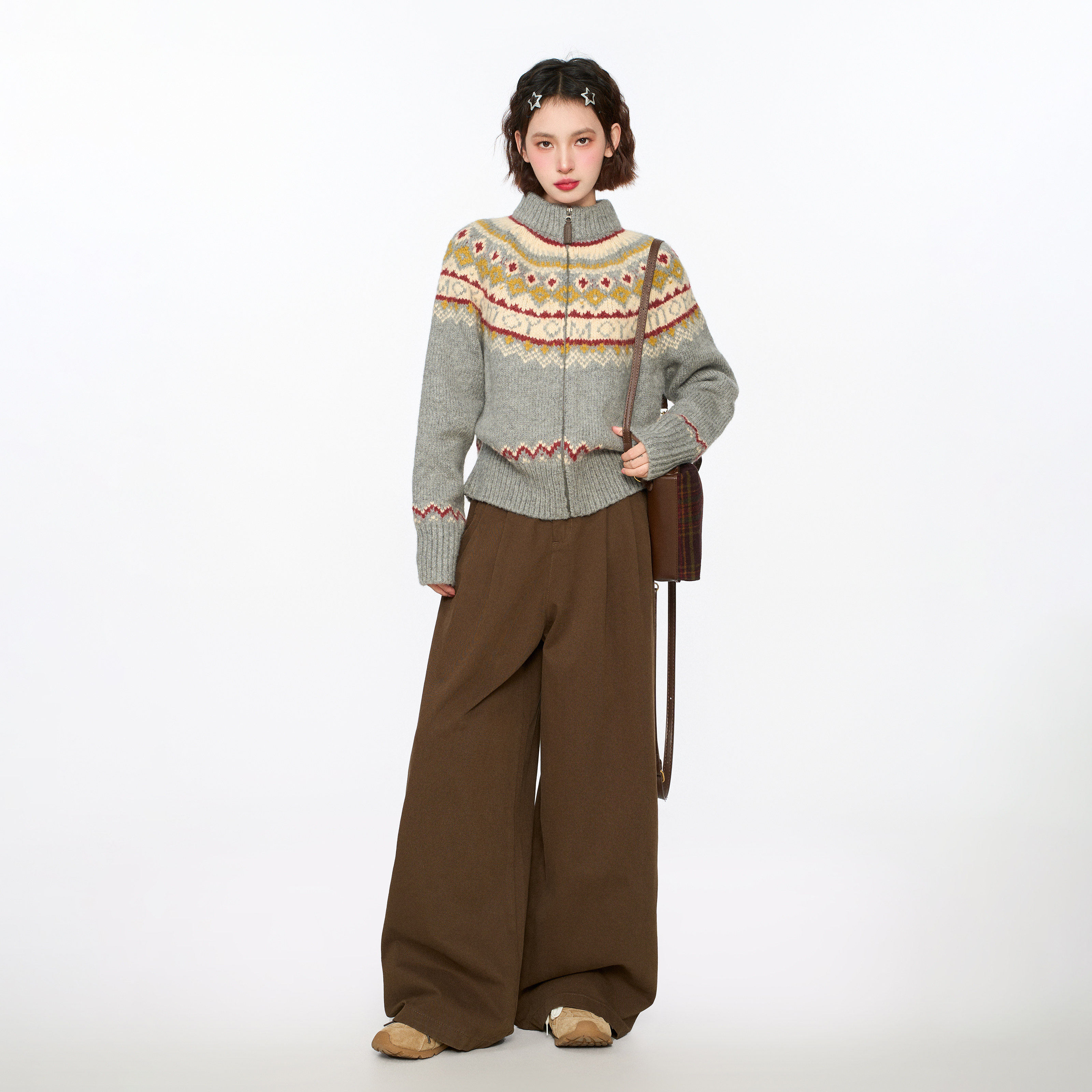 灰色费尔岛高领拉链毛衣开衫女秋冬季慵懒复古加厚针织衫外套冬季