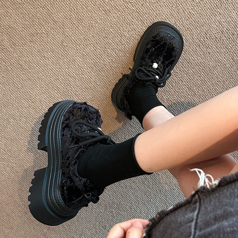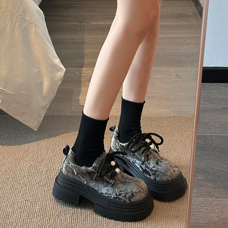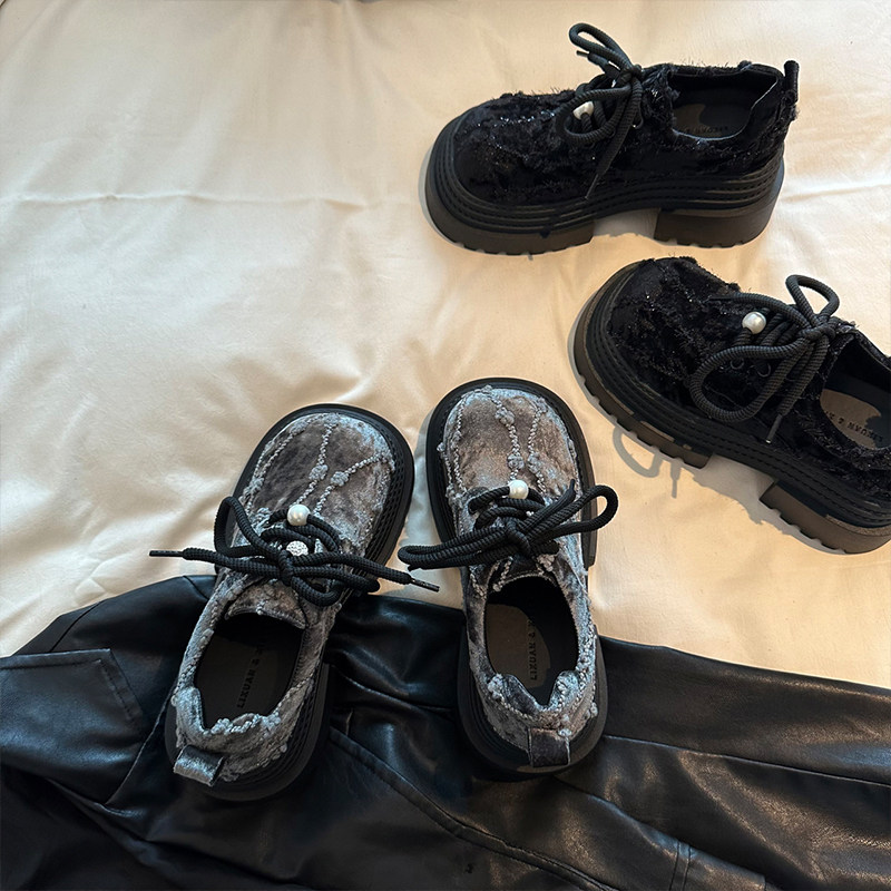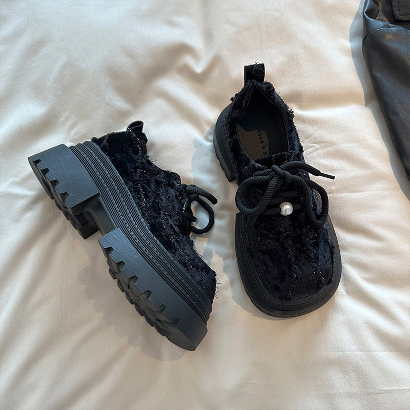 中国风绒面珍珠JK小皮鞋2025春季新款厚底松糕小个子增高乐福鞋女