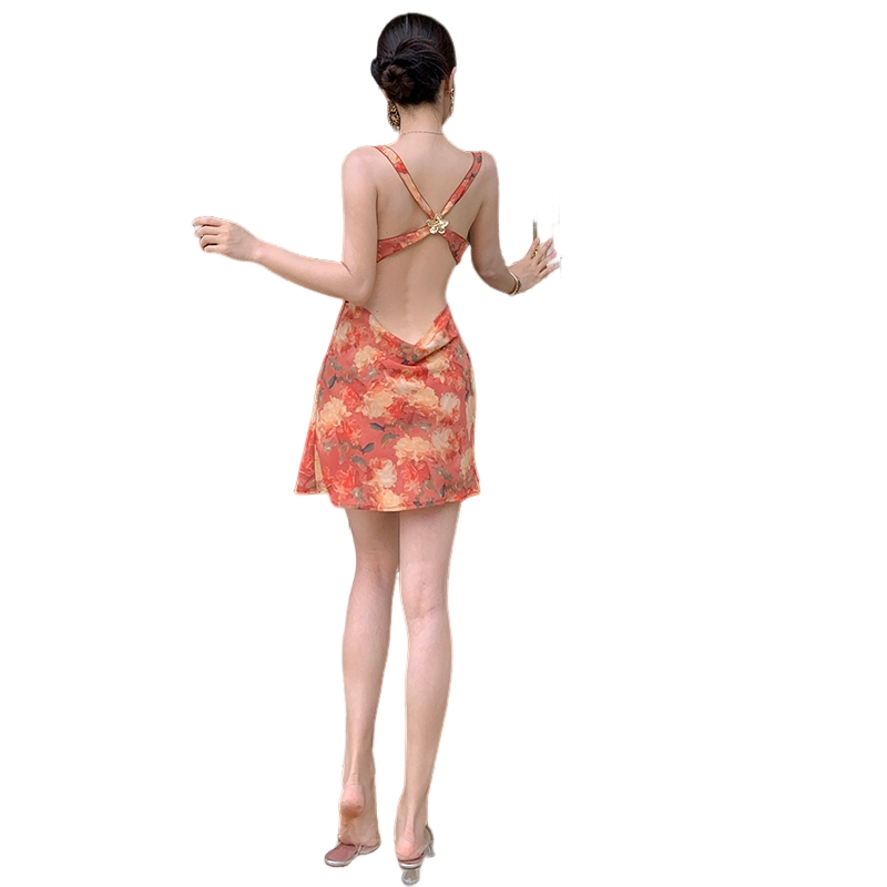 复古红碎花连衣裙女性感露背吊带显瘦海边度假短裙子