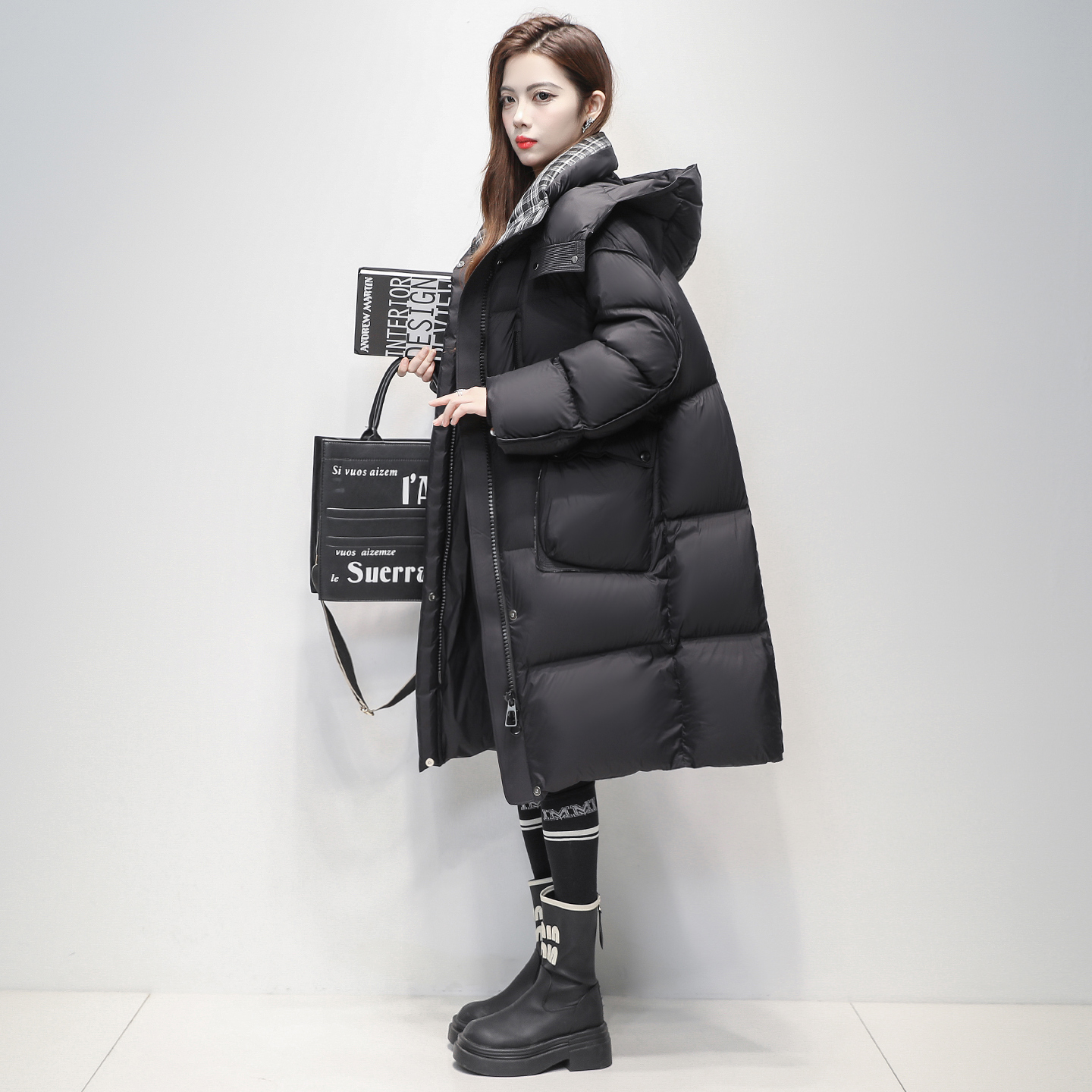 久拉拉 黑色连帽白鸭绒羽绒服女中长款2025冬季新款宽松加厚外套