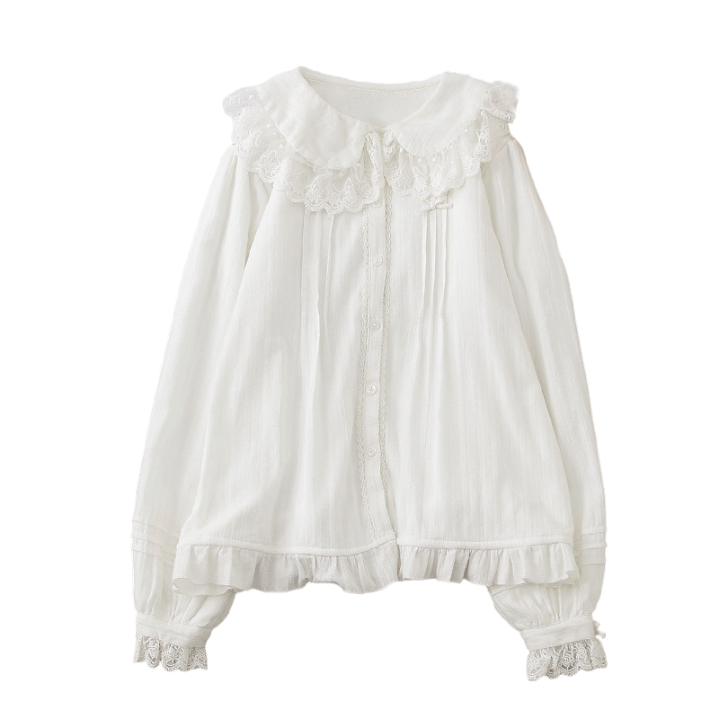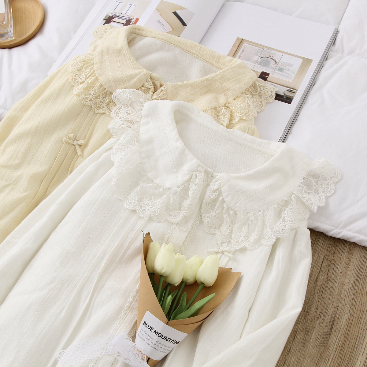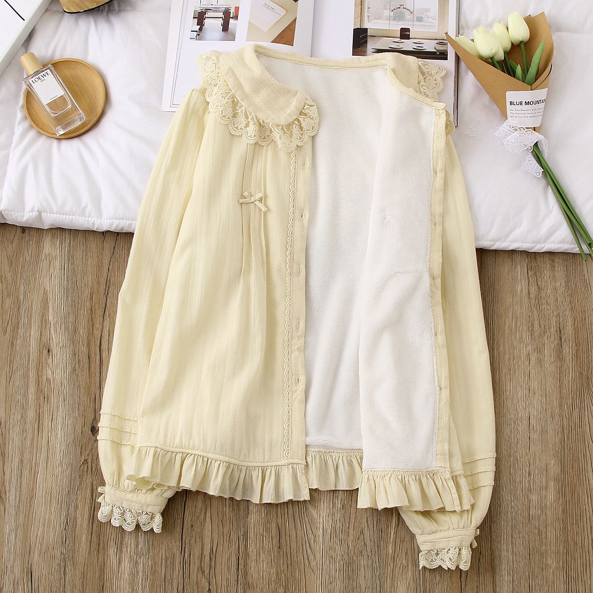 减龄日系娃娃领长袖蕾丝宫廷风甜美衬衫加绒加厚白色衬衣女蝴蝶结
