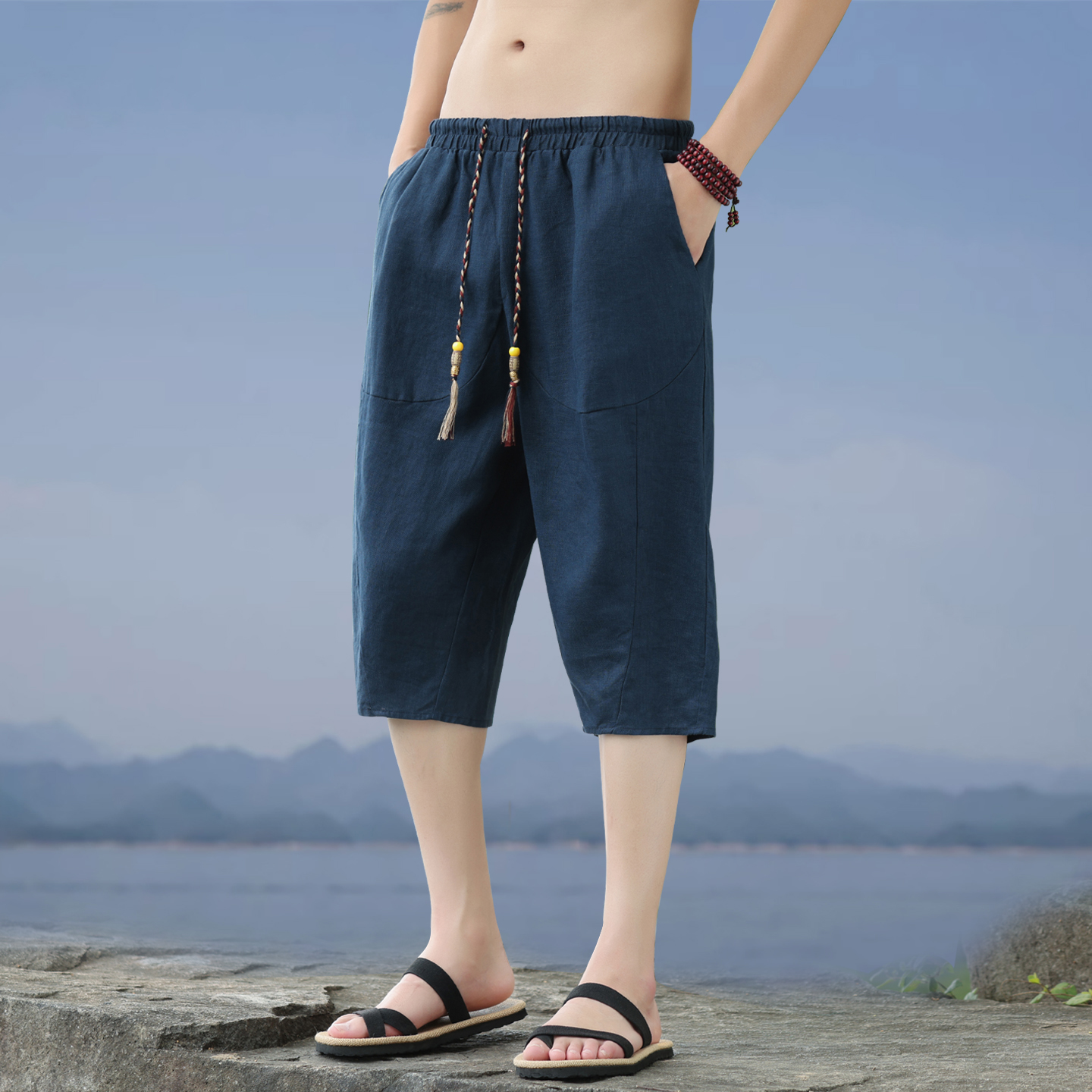100%亚麻短裤男外穿七分裤男士休闲裤宽松薄款中国风裤子2025夏季