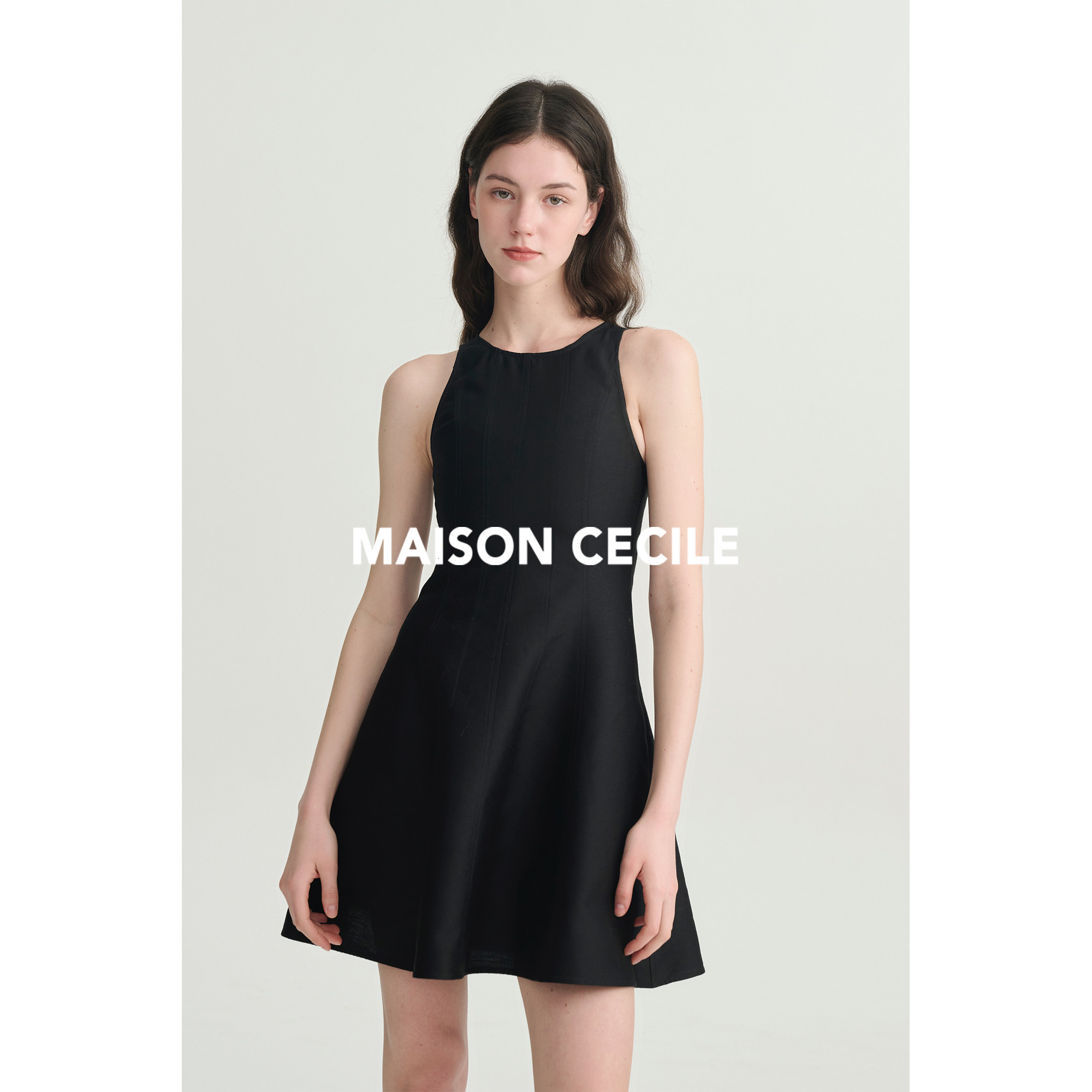 MAISON CECILE黑白真丝羊毛破缝收腰礼服连衣裙