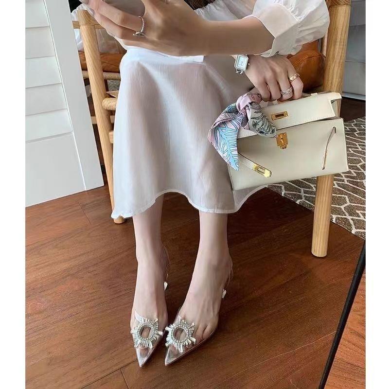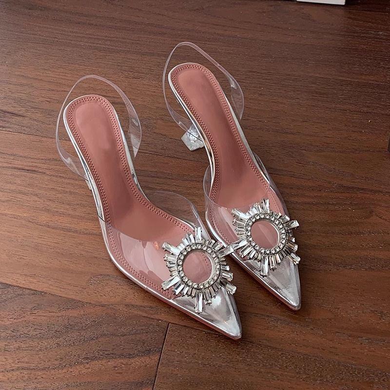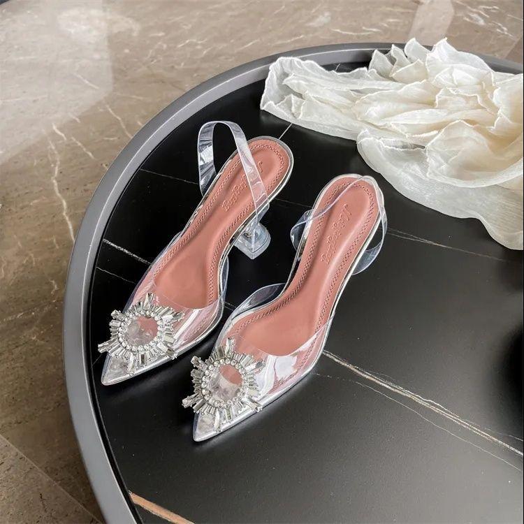 时尚水钻透明时装凉鞋女2025夏季新款细跟百搭包头水晶跟高跟凉鞋