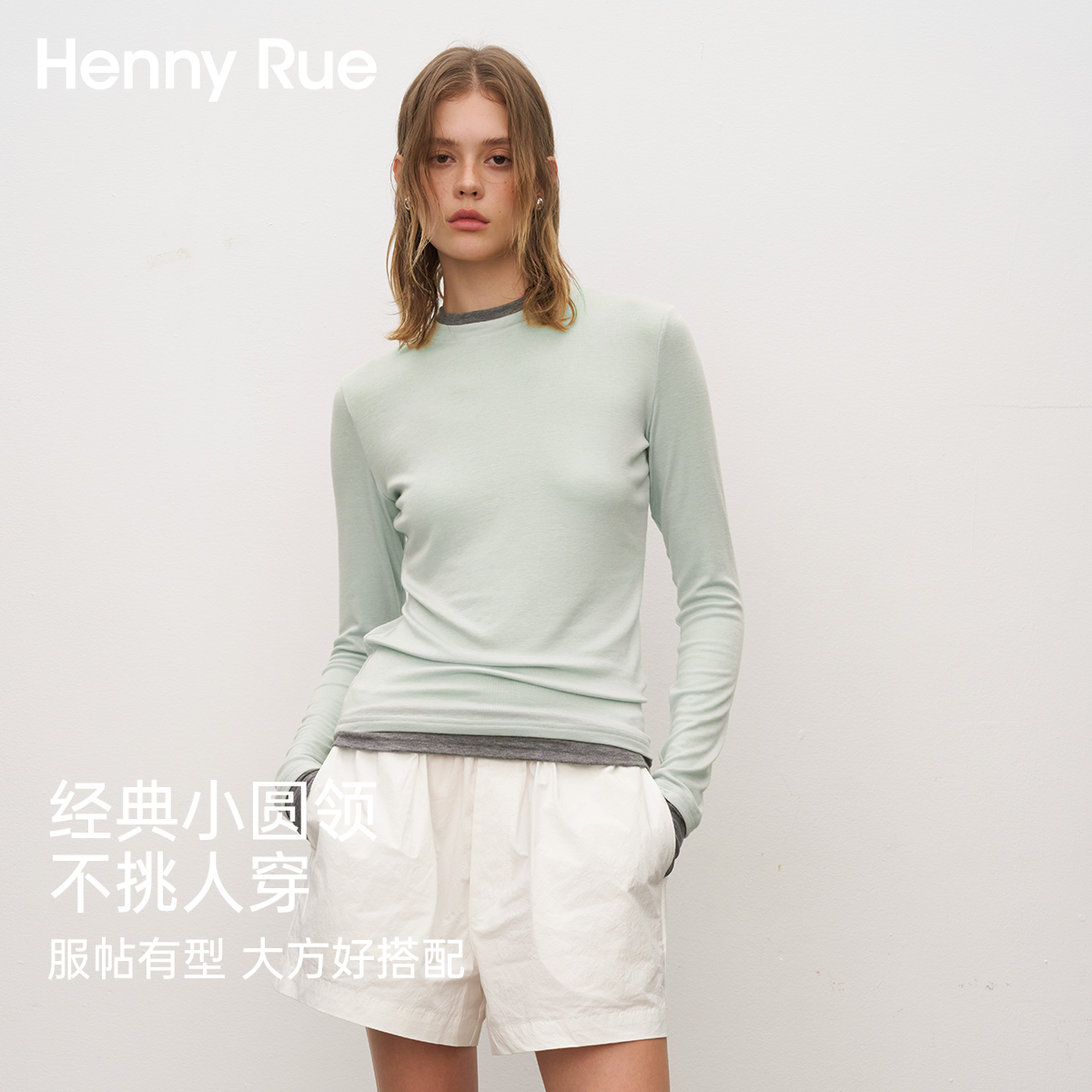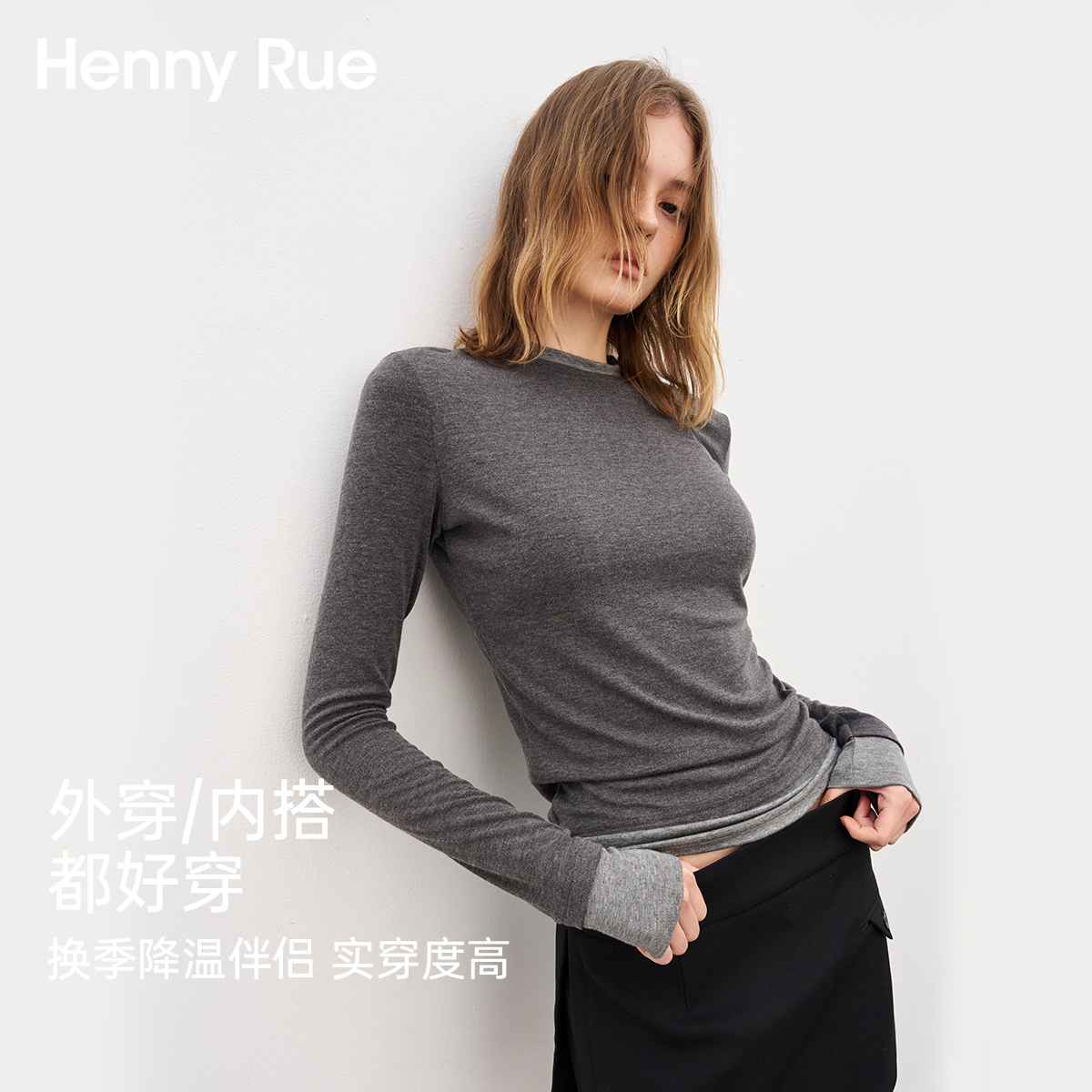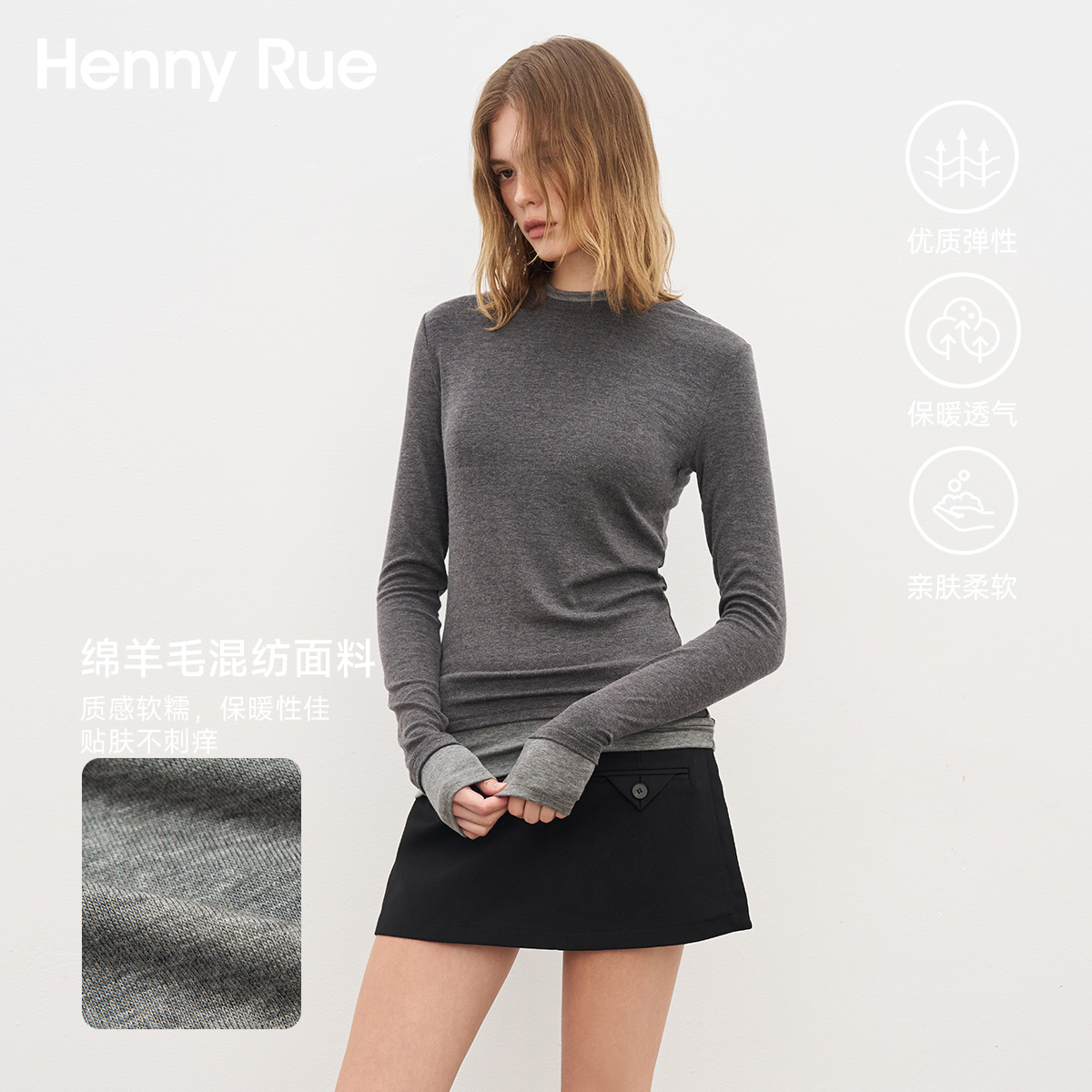 HENNY RUE亨尼露秋冬女士含绵羊毛撞色假两件慵懒百搭打底上衣T恤