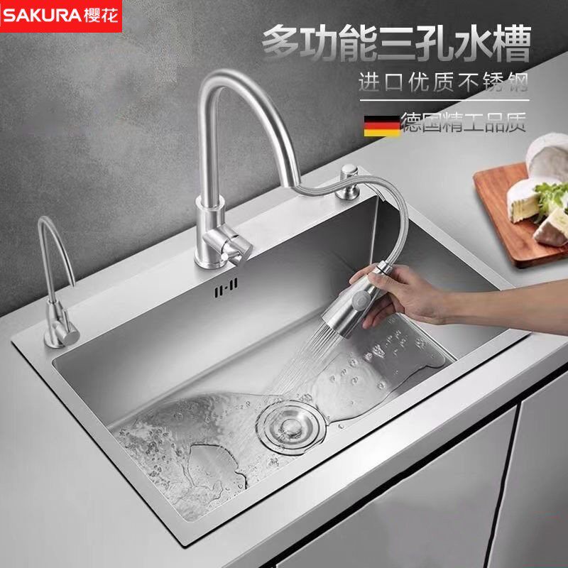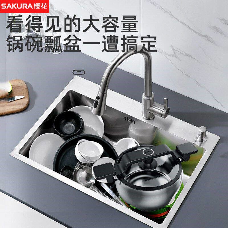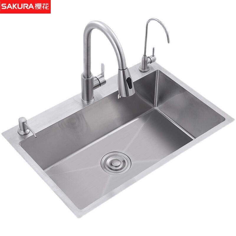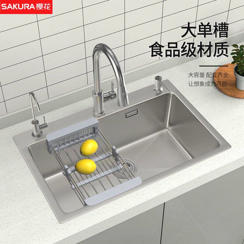樱花厨房大单槽不锈钢洗菜盆加厚手工水槽家用洗碗池台上盆304可