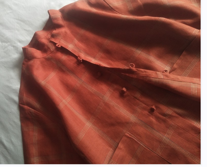 青辰原创春夏秋新款大码立领格子纯亚麻上衣女灯笼袖衬衫外套薄