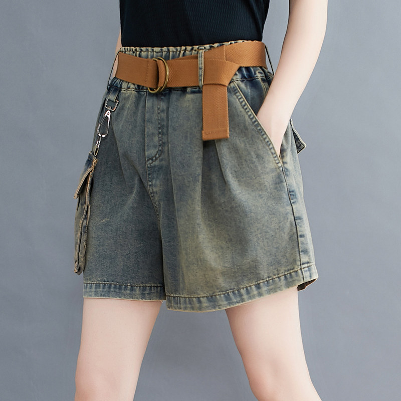 高腰牛仔短裤女2024夏季新款宽松大码个性大口袋显瘦A字阔腿热裤