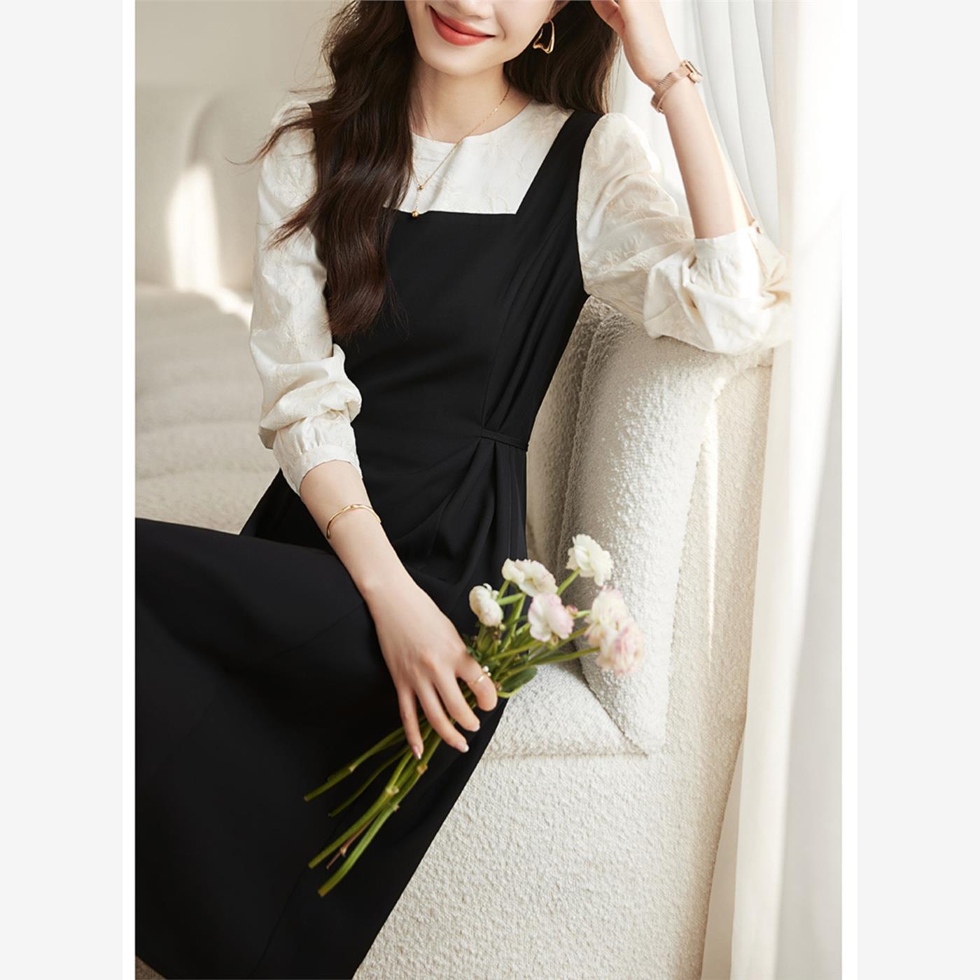 提花小衫假两件连衣裙春季新款小清新收腰显瘦减龄百搭长袖裙