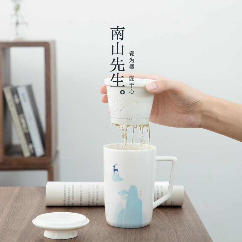 南山先生九色鹿陶瓷马克杯带盖过滤茶杯个性大水杯办公室泡茶杯子