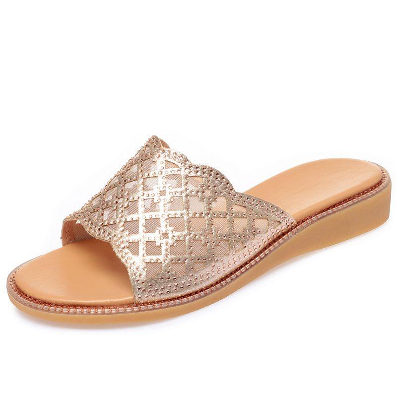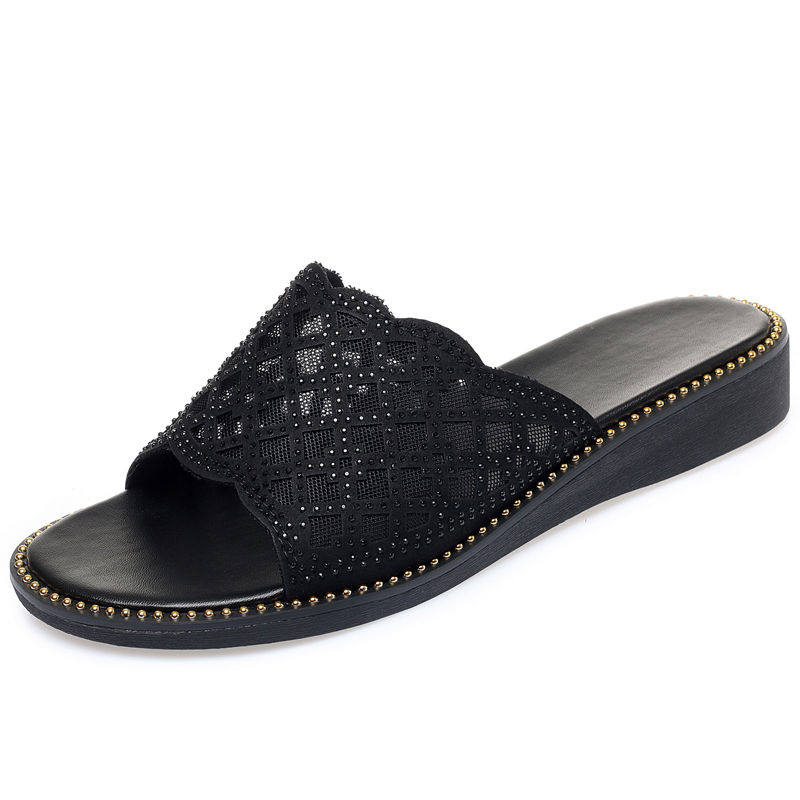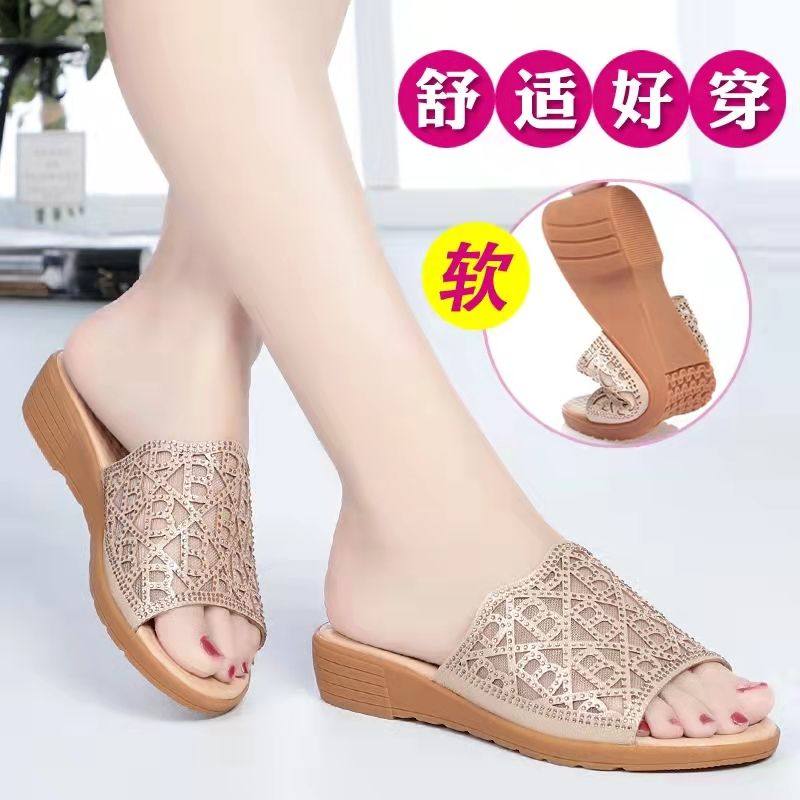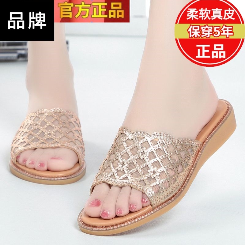 2024夏季新款真软皮妈妈拖鞋女平跟平底防滑凉鞋外穿网纱一字拖拖