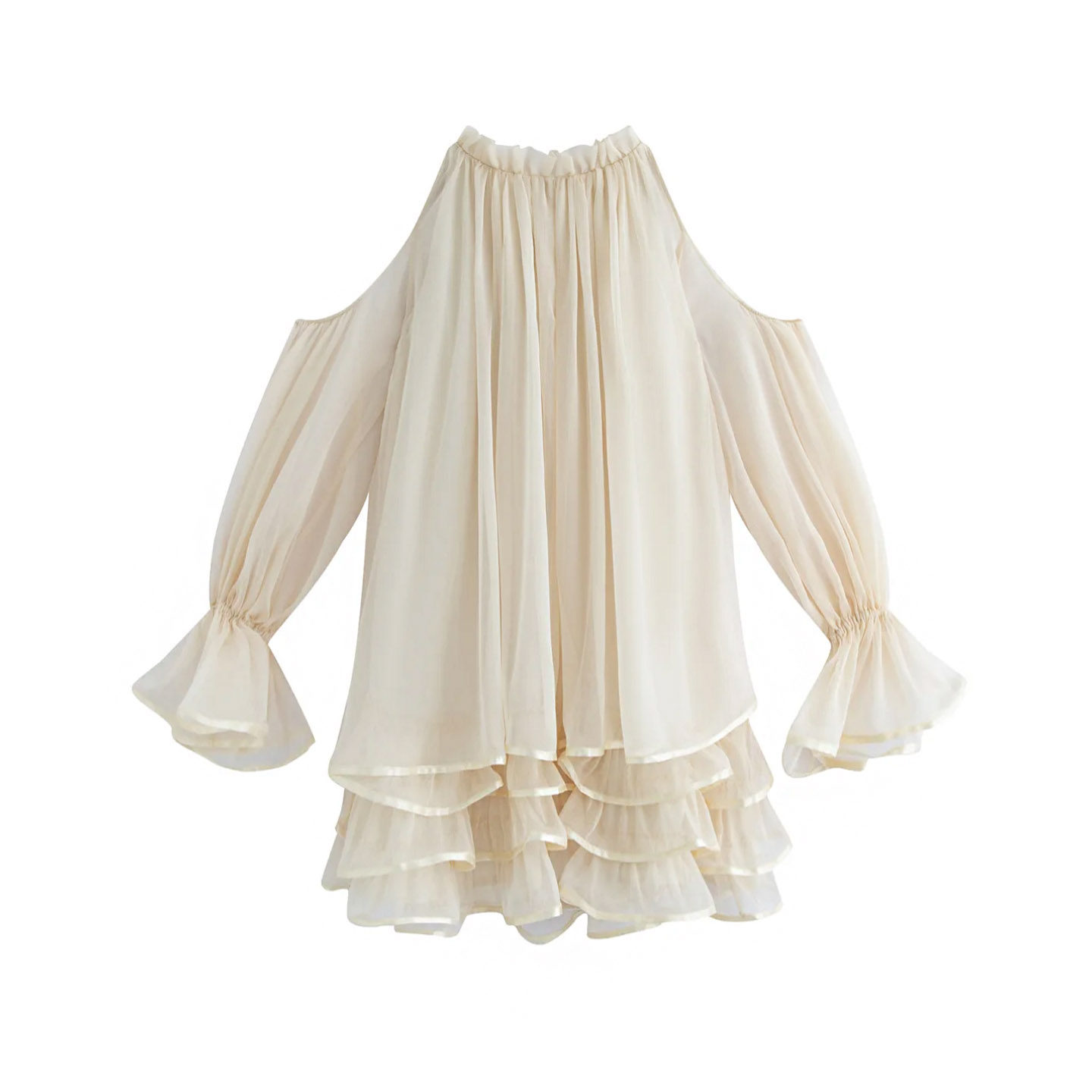 田曦薇同款温柔风露肩连衣裙女2026年早春荷叶边雪纺显瘦优雅短裙