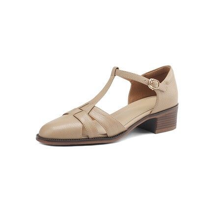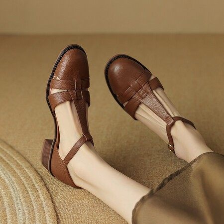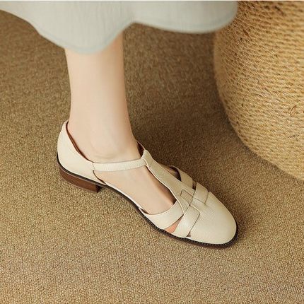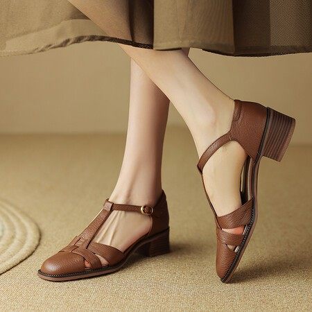 真皮包头复古罗马凉鞋女粗跟2024夏季新款编织中跟猪笼鞋中空包跟