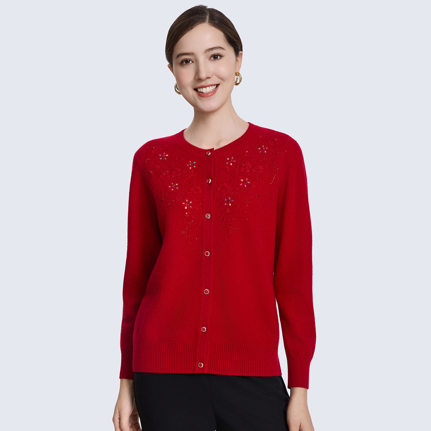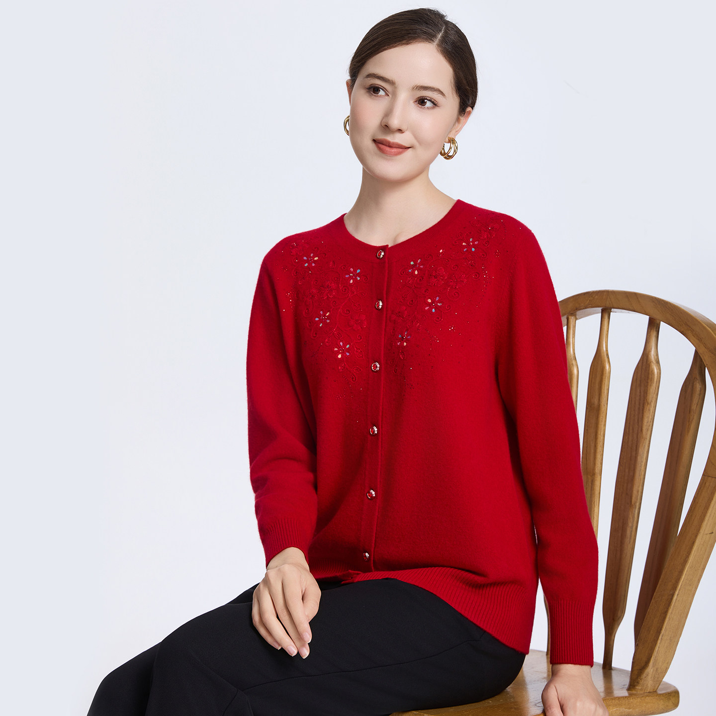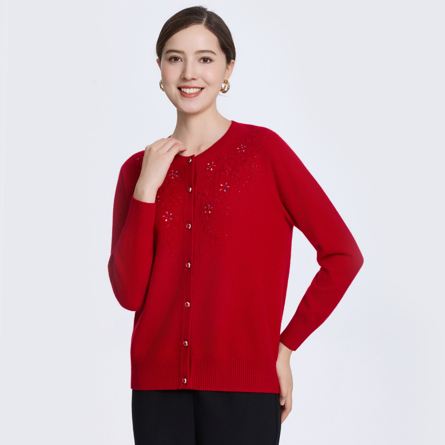 赏心岁月中老年女装妈妈羊毛衫针织开衫本命年红色上衣