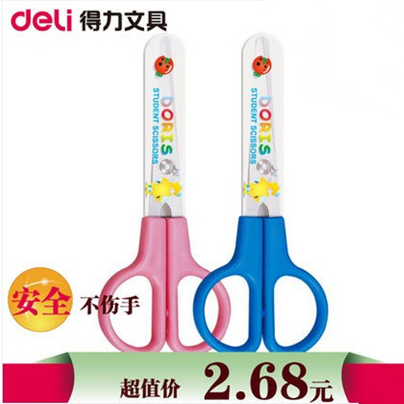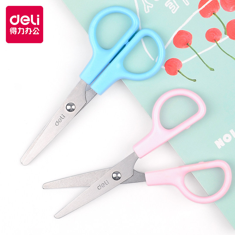 得力6021儿童用安全剪刀带保护套蓝色/粉色不锈钢学生手工小剪刀