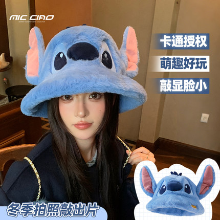 迪士尼史迪仔帽子女2025新款毛绒渔夫帽秋冬保暖显脸小盆帽百搭潮