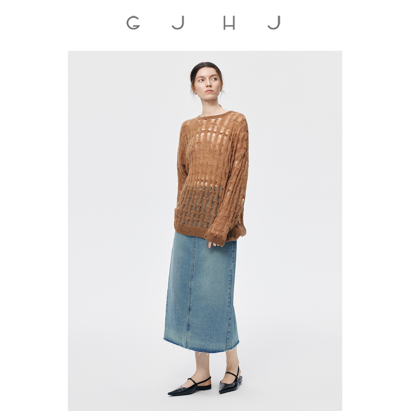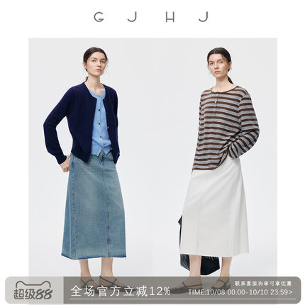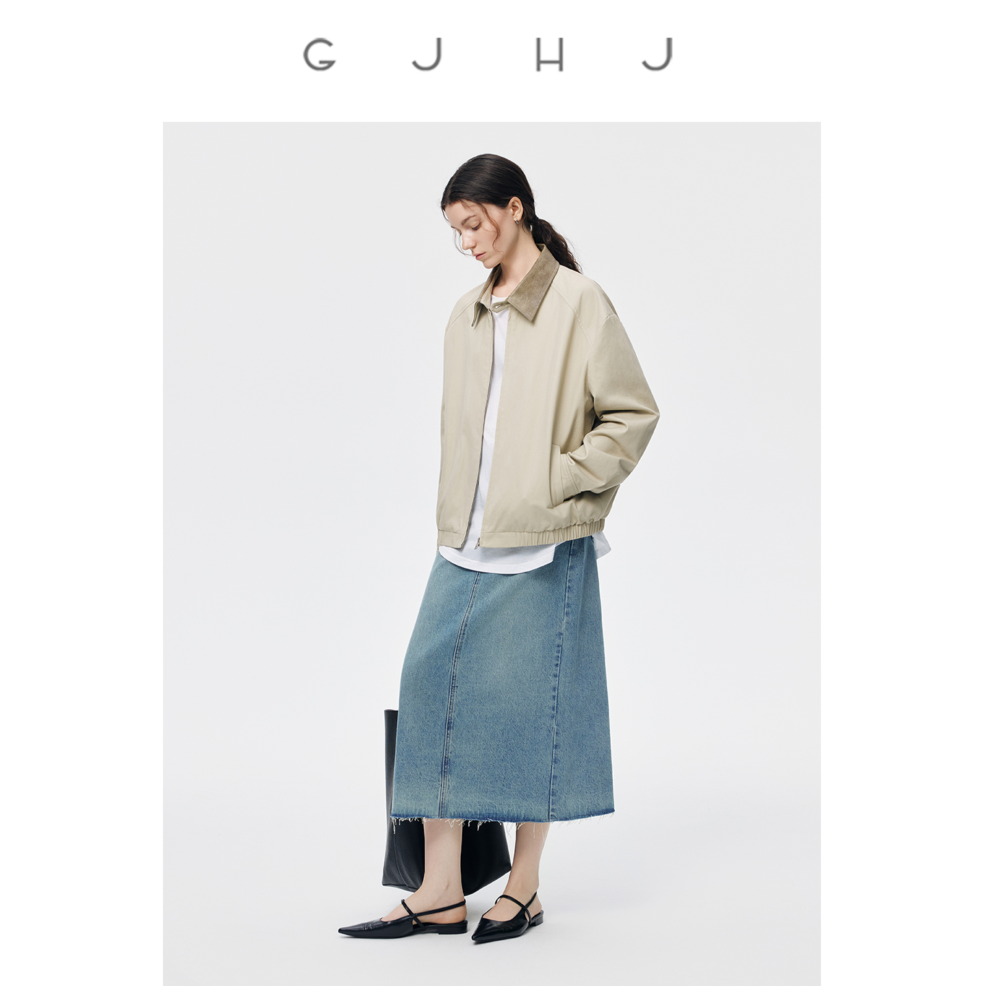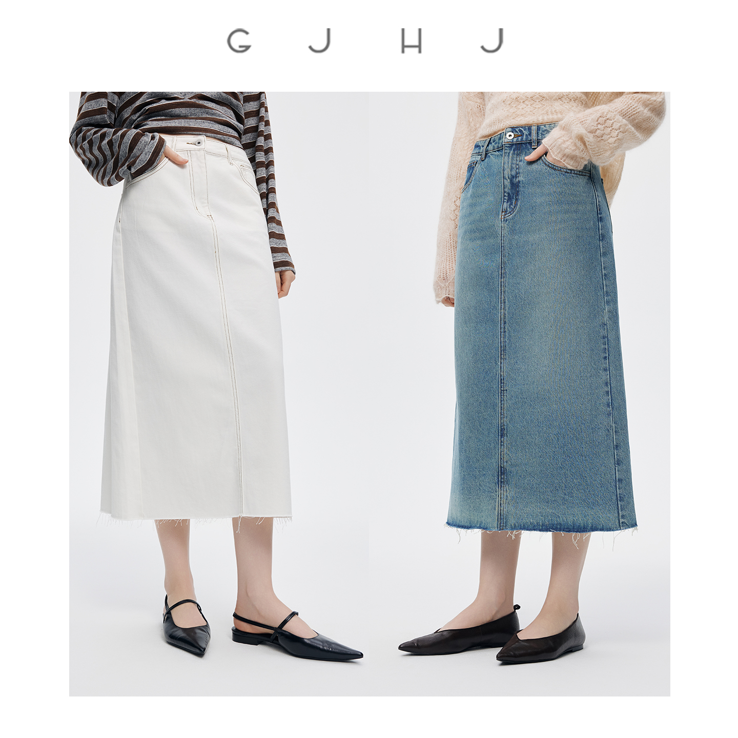 gjhj牛仔半身裙 经典磨毛 纯棉高腰A字后开叉 2025秋季 复古慵懒