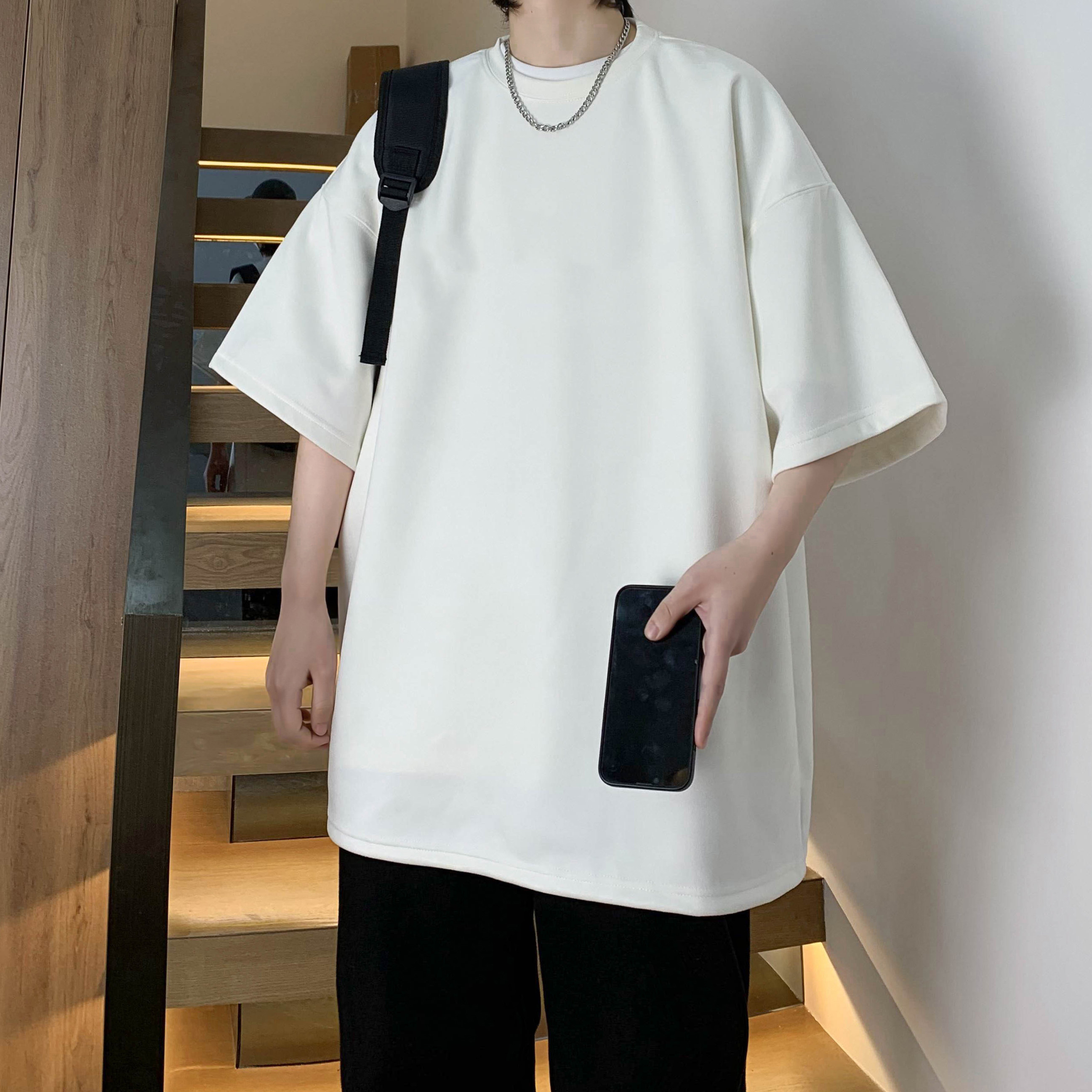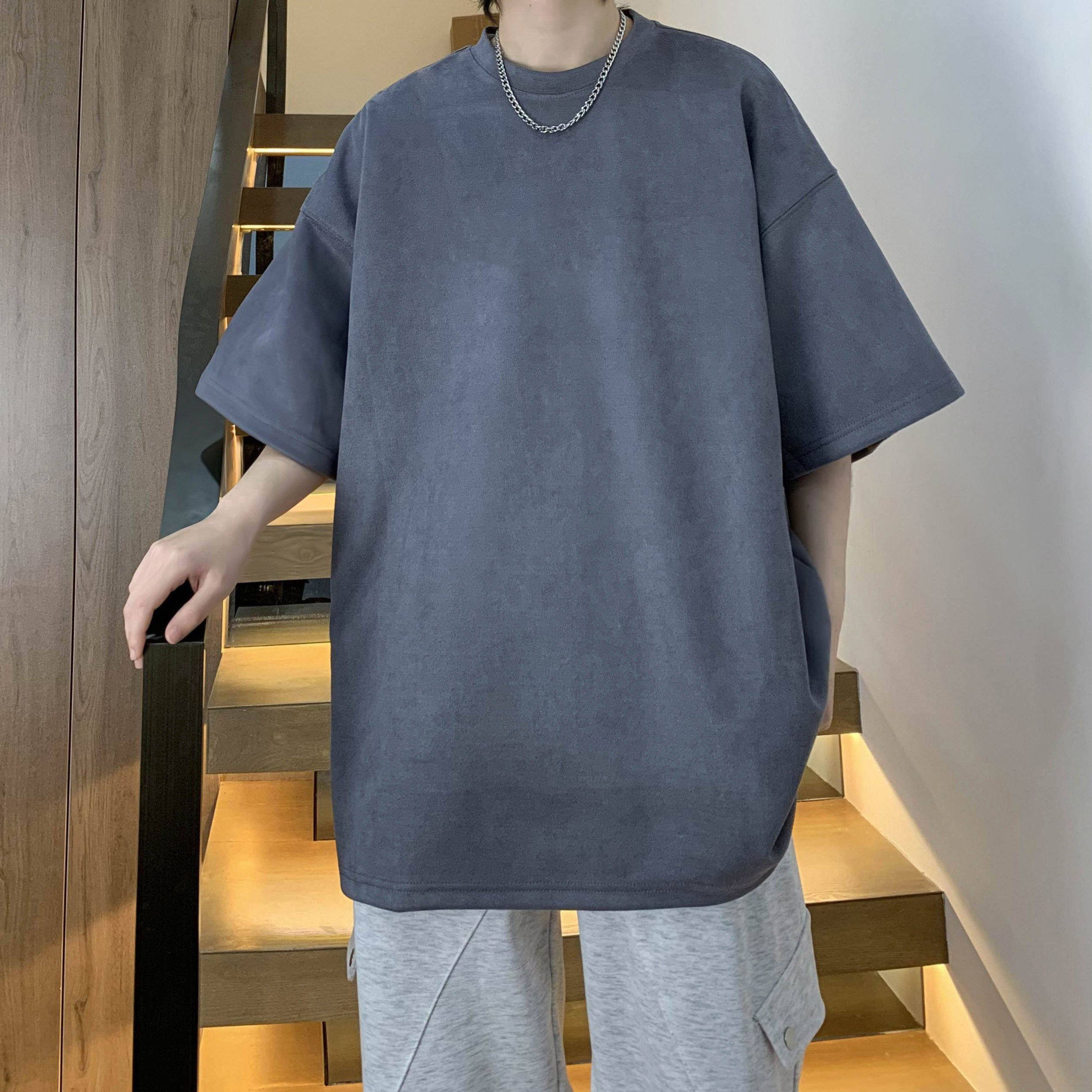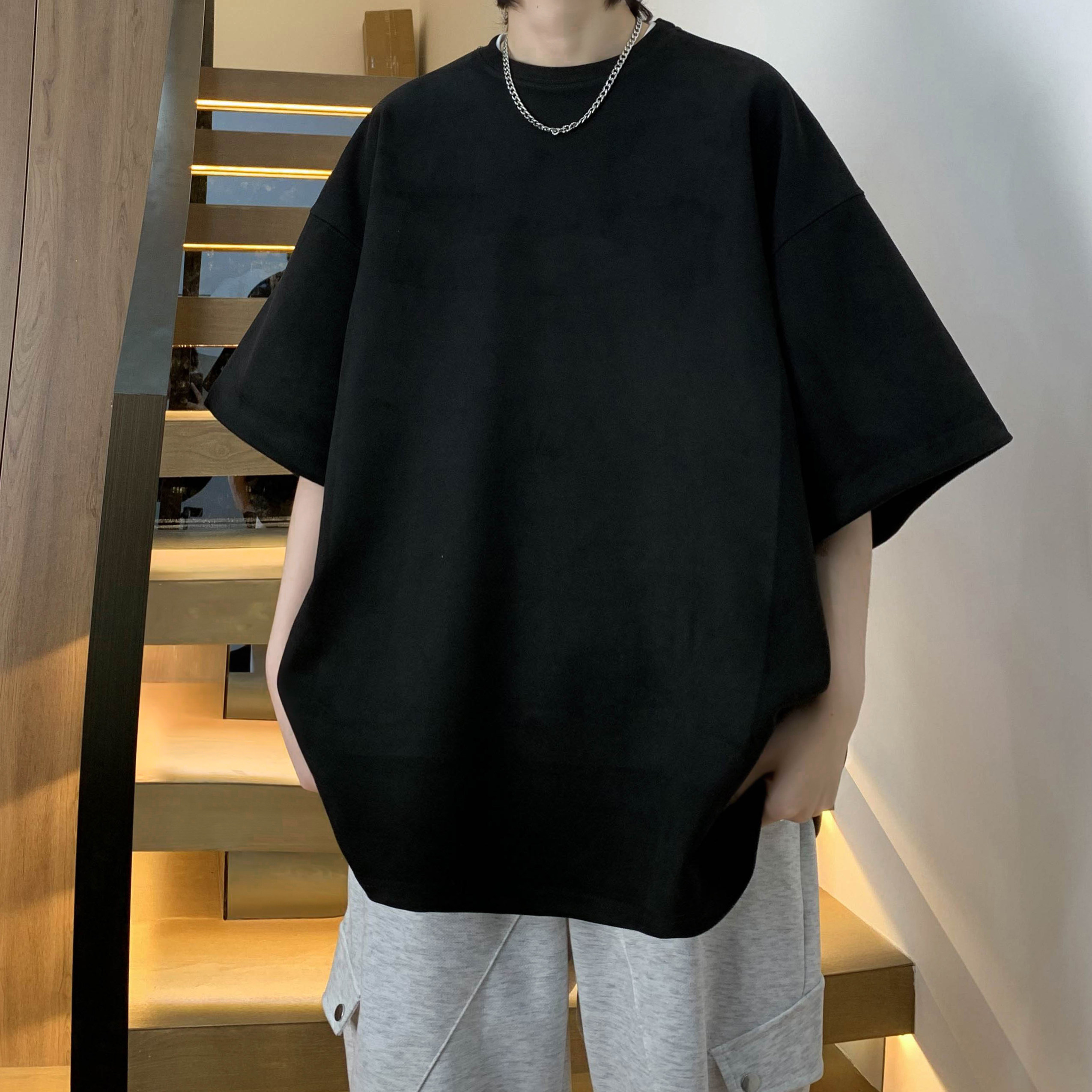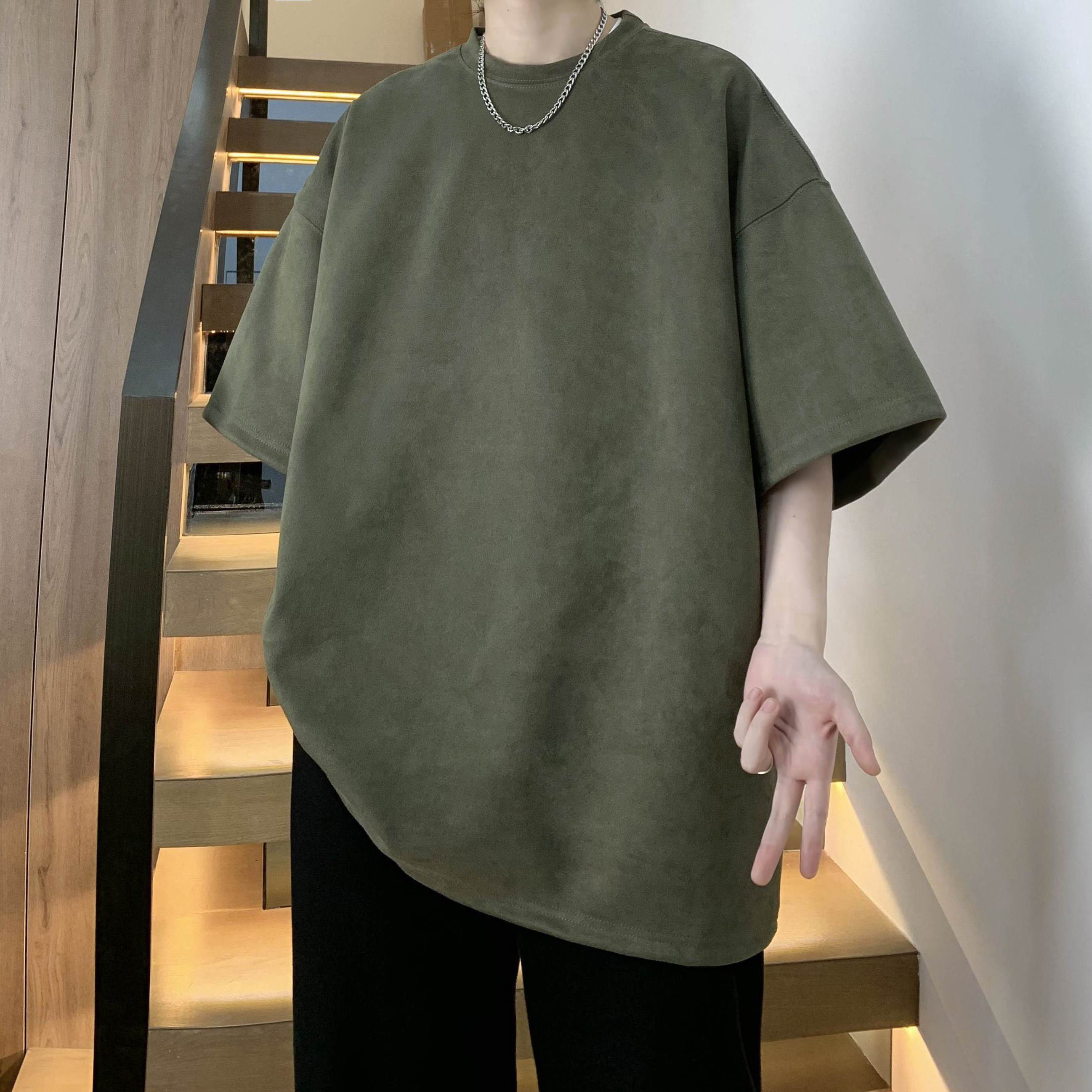 重磅麂皮绒短袖t恤男款夏季纯色青少年宽松圆领鹿皮绒五分袖上衣