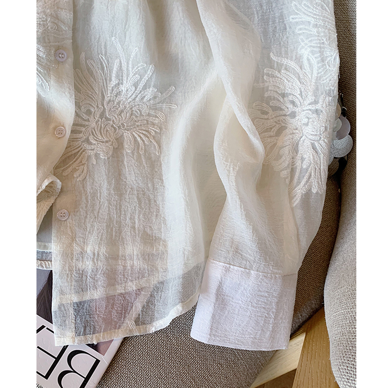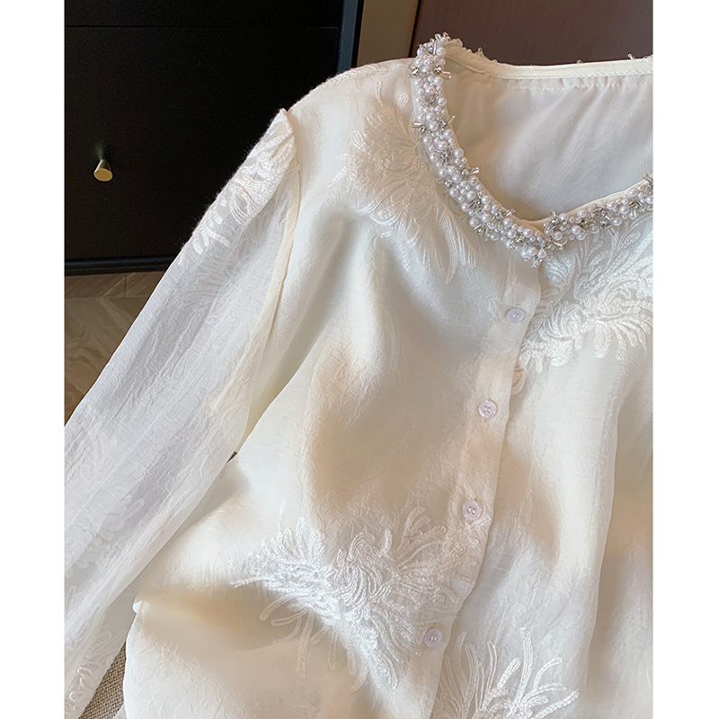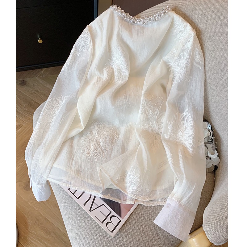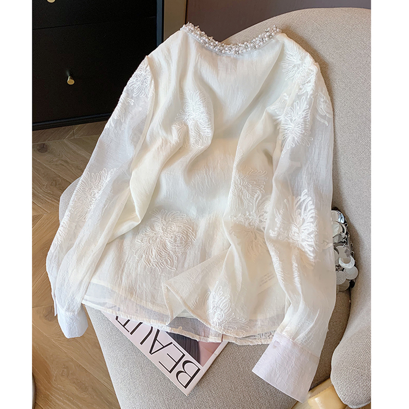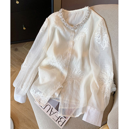 白色重工钉珠刺绣国风衬衫女2025春夏新款气质薄款防晒新中式上衣