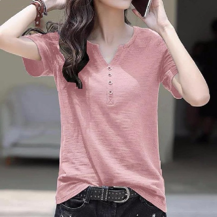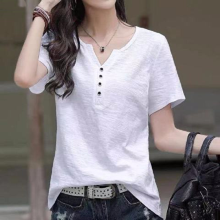 夏季新款短袖t恤女v领宽松显瘦韩版百搭大码简约半袖体恤上衣