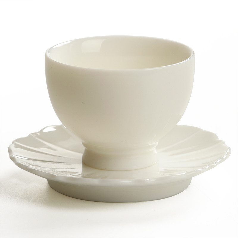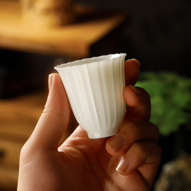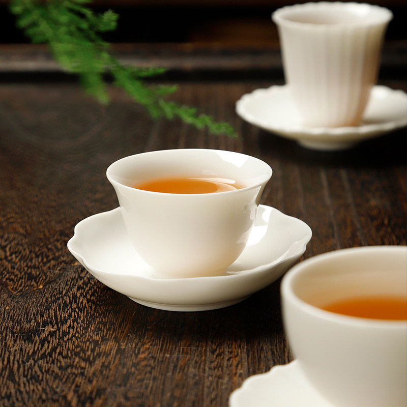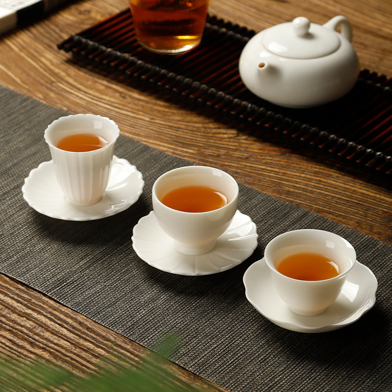 甜白瓷品茗杯个人日式小茶杯套装陶瓷纯色主人杯隔热杯垫防烫杯托
